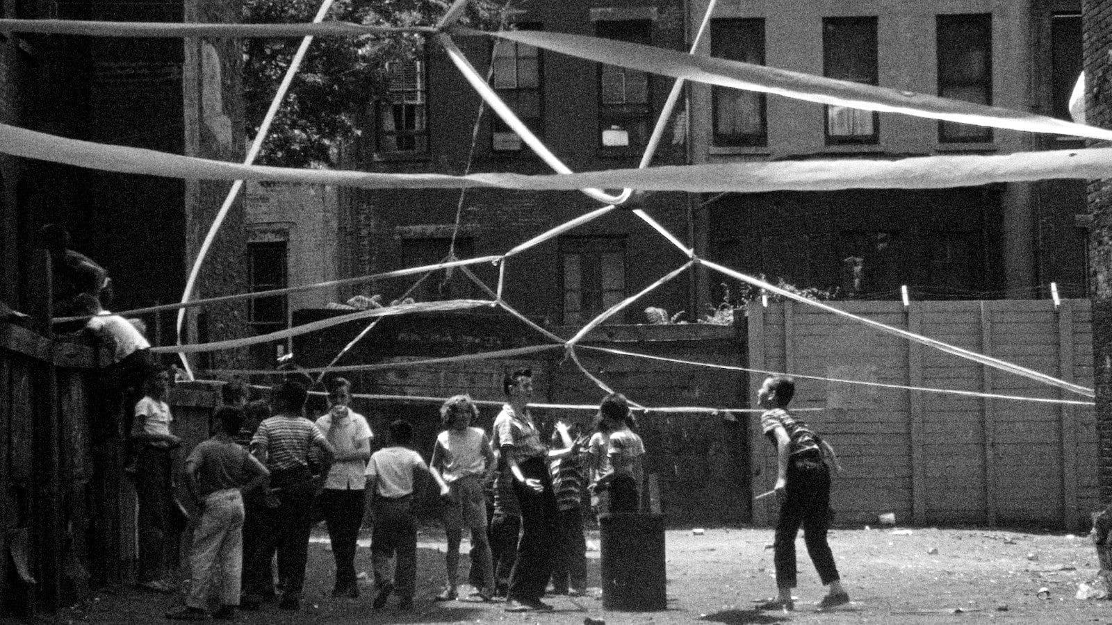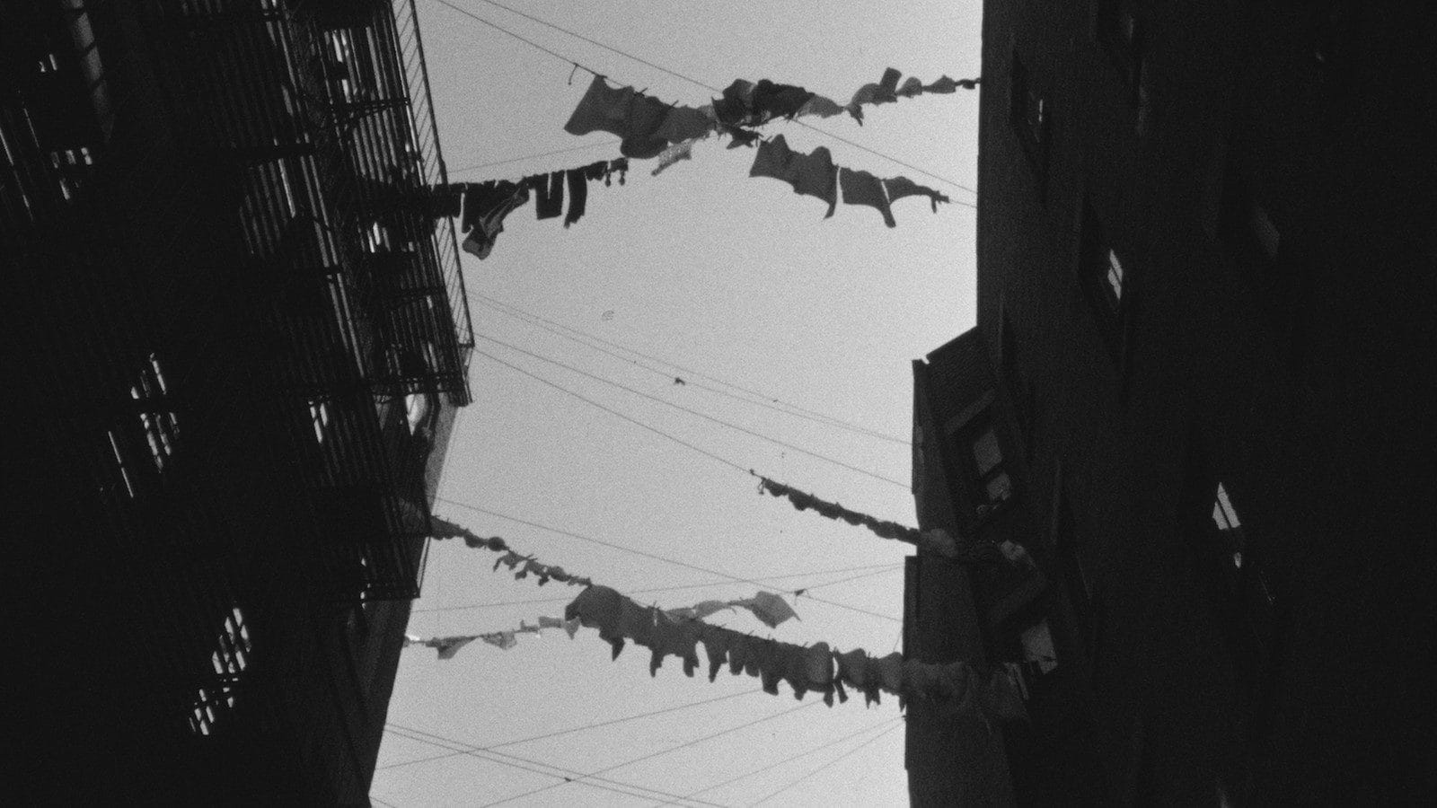 With Free Time, Kircheimer slows down a bit. He plays around with NYC’s soundscape; sometimes we hear strains of Ravel, Bach, Eisler, or Count Basie, and sometimes we hear the giggles of children, an ice cream truck’s jingle, the passing of trains, or the hissing of a fire hydrant. We see clothes strung on lines against an afternoon sky, women sitting at their windows gazing out, men chatting, reading newspapers on their stoops, and children playing stickball.