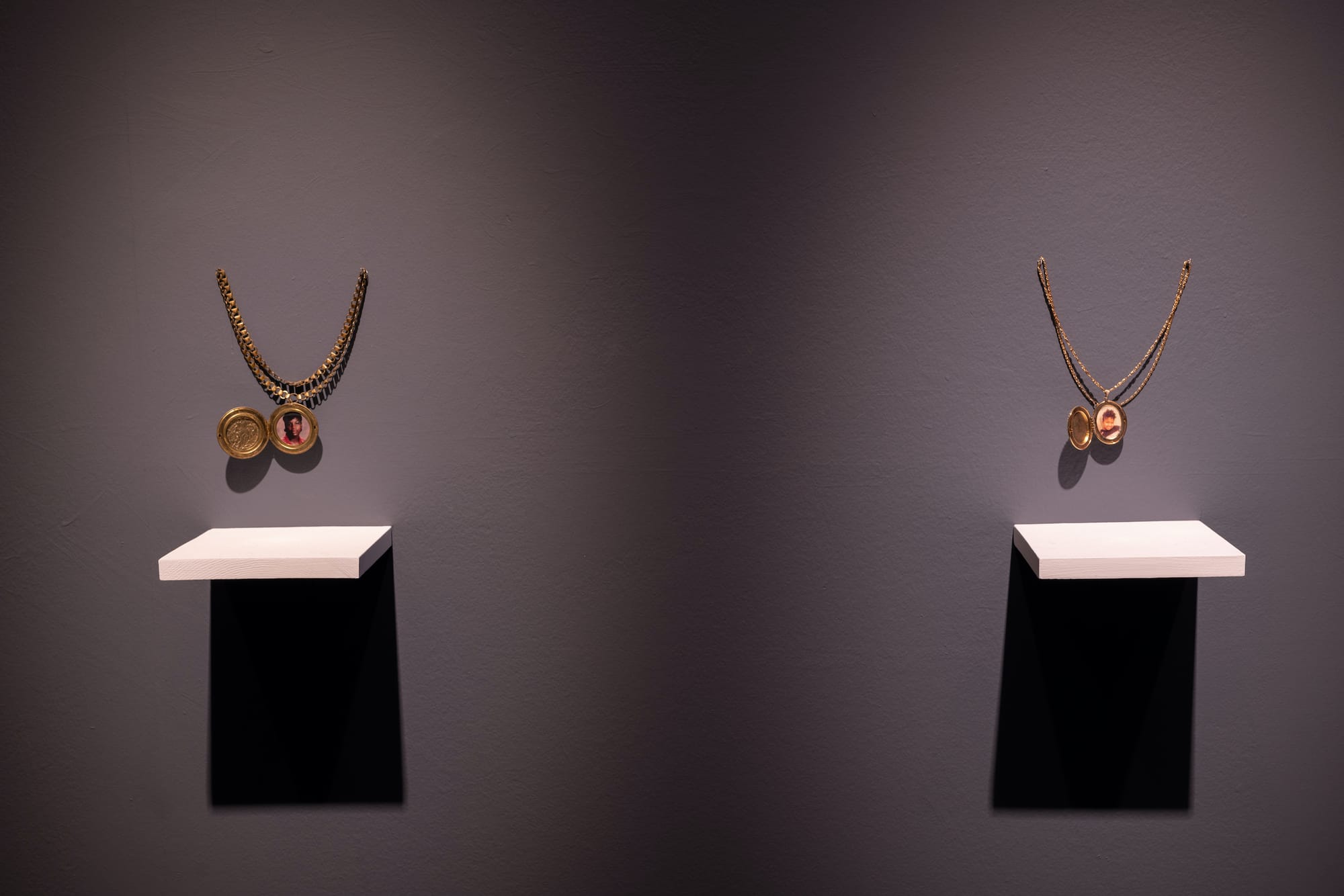 Gently but unflinchingly, the exhibition treads through more painful subjects. The final gallery, Rituals and Prayer, houses the eponymous altar. The wide-ranging showpiece of iconic items of Black girlhood is a collection of community offerings gathered over the monument’s travels throughout various Chicago neighborhoods. Initially conceived in 2021, over the years the altar has grown and collected individual artifacts of girlhood like dolls, make-up, stuffed animals, jewelry, and more. The ghost of girlhood, anyone’s and everyone’s, is present in each item. The back wall displays necklaces and lockets containing the pictures and names of missing Black girls and women. Leah Gipson’s neon sign hangs over the installation. Speaking for the women and girls who are no longer with us, she implores viewers to forget them not.