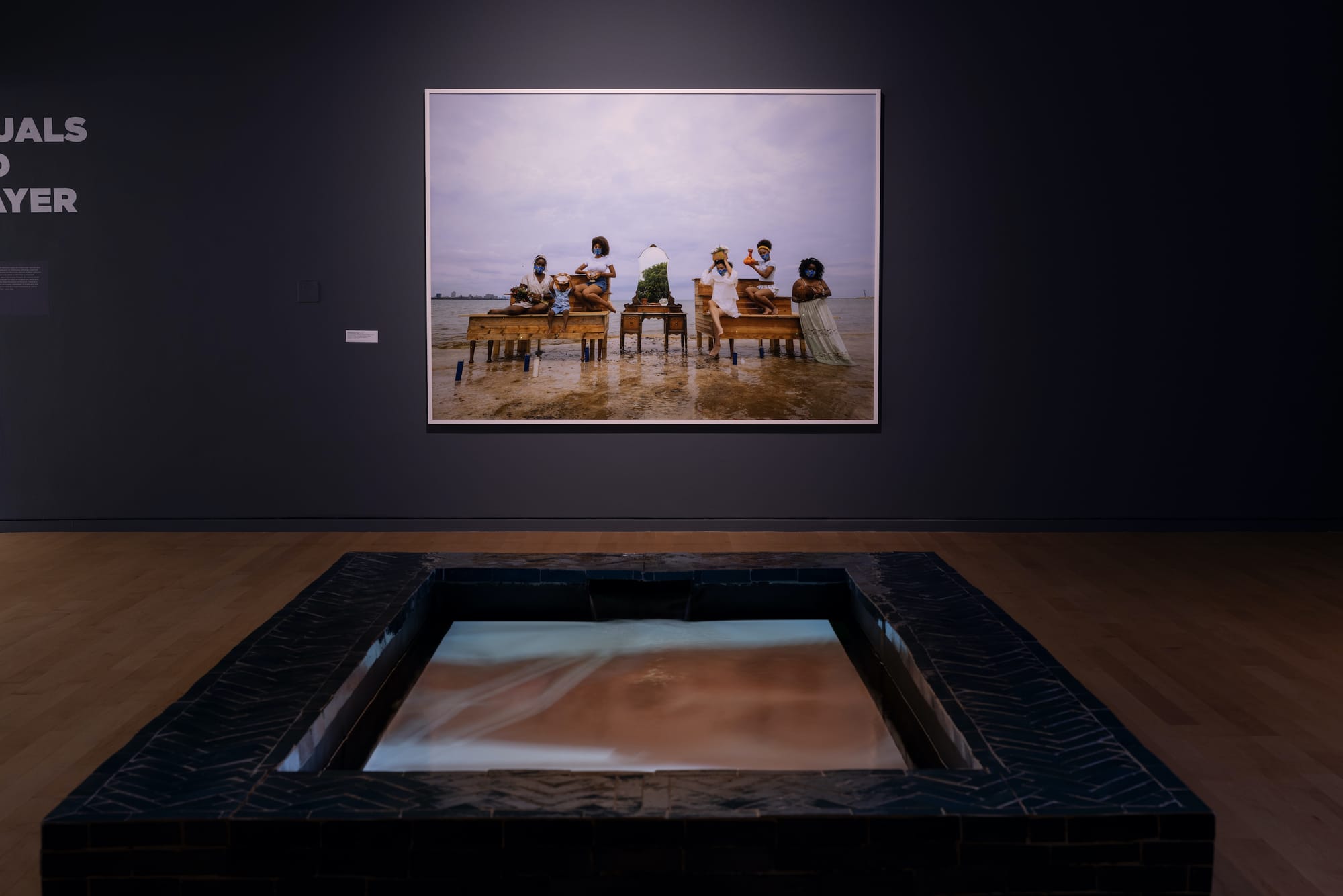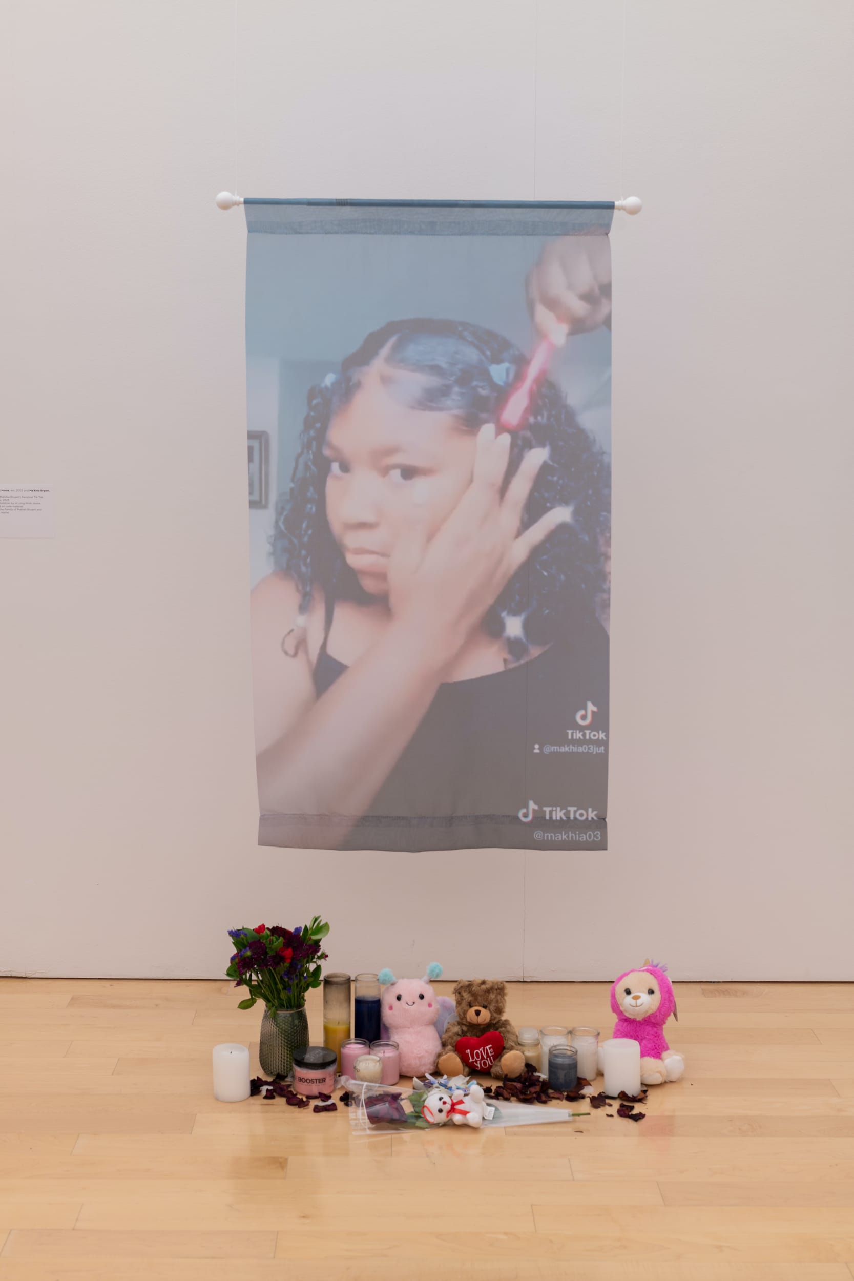 The exhibition at the Chicago Cultural Center opens with the installation “Homegoing.” The work is a suspended image depicting a screenshot from Ma'Khia Bryant’s personal TikTok. In the photo she’s laying her edges, her jet-black hair shining, her baby face clean and free of makeup. Below the printed photo is a collection of candles, stuffed animals, and a bouquet. On April 20, 2021, Ma'Khia was killed by an Ohio police officer in what was later determined a justifiable homicide. She was 16 years old.