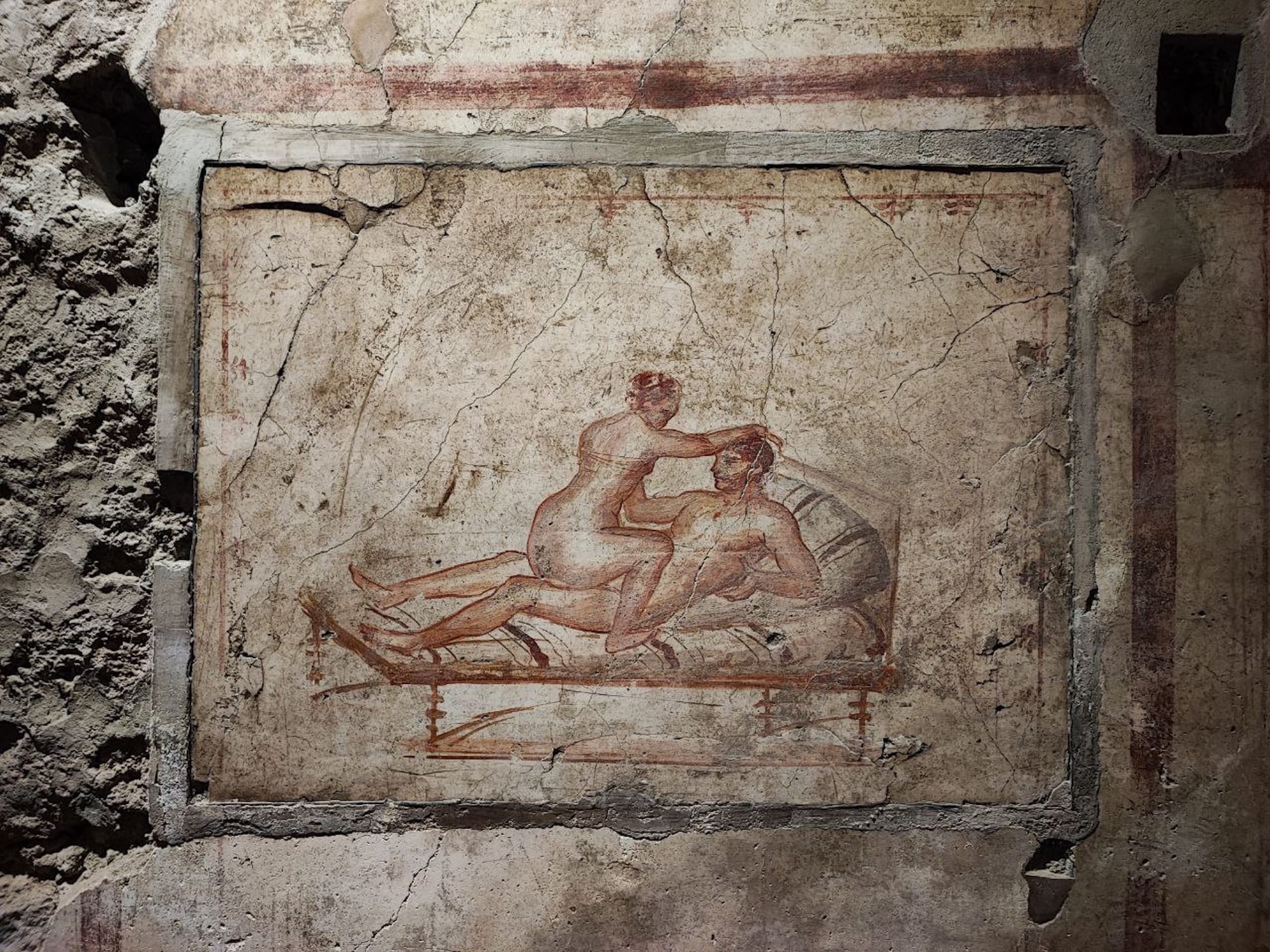 More straightforward erotic images exist in a room thought to have been used for prostitution. The space was accessible through an iron door, and an inscription on the wall referenced a "Greek woman of pleasant manners" who was paid two copper coins. Other sections of the grand home include women's and enslaved people's quarters.