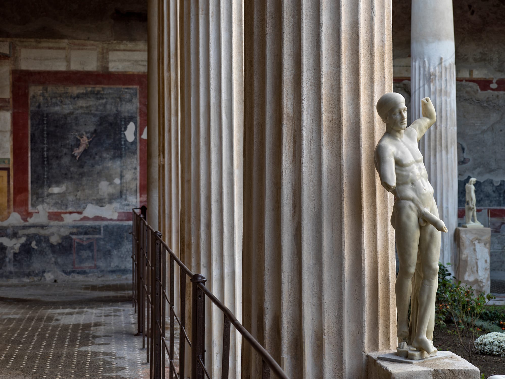 The Pompeii home was excavated in the late 1800s, and over the course of the following century, wax was painted over the frescoes in an attempt to preserve them. Removing the wax without damaging the underlying imagery proved difficult, but the home needed more structural repairs, too. A new roof was added, and among other massive projects, the team restored the water channels in the home's 18-column peristyle, and replanted ancient flora back into the garden.