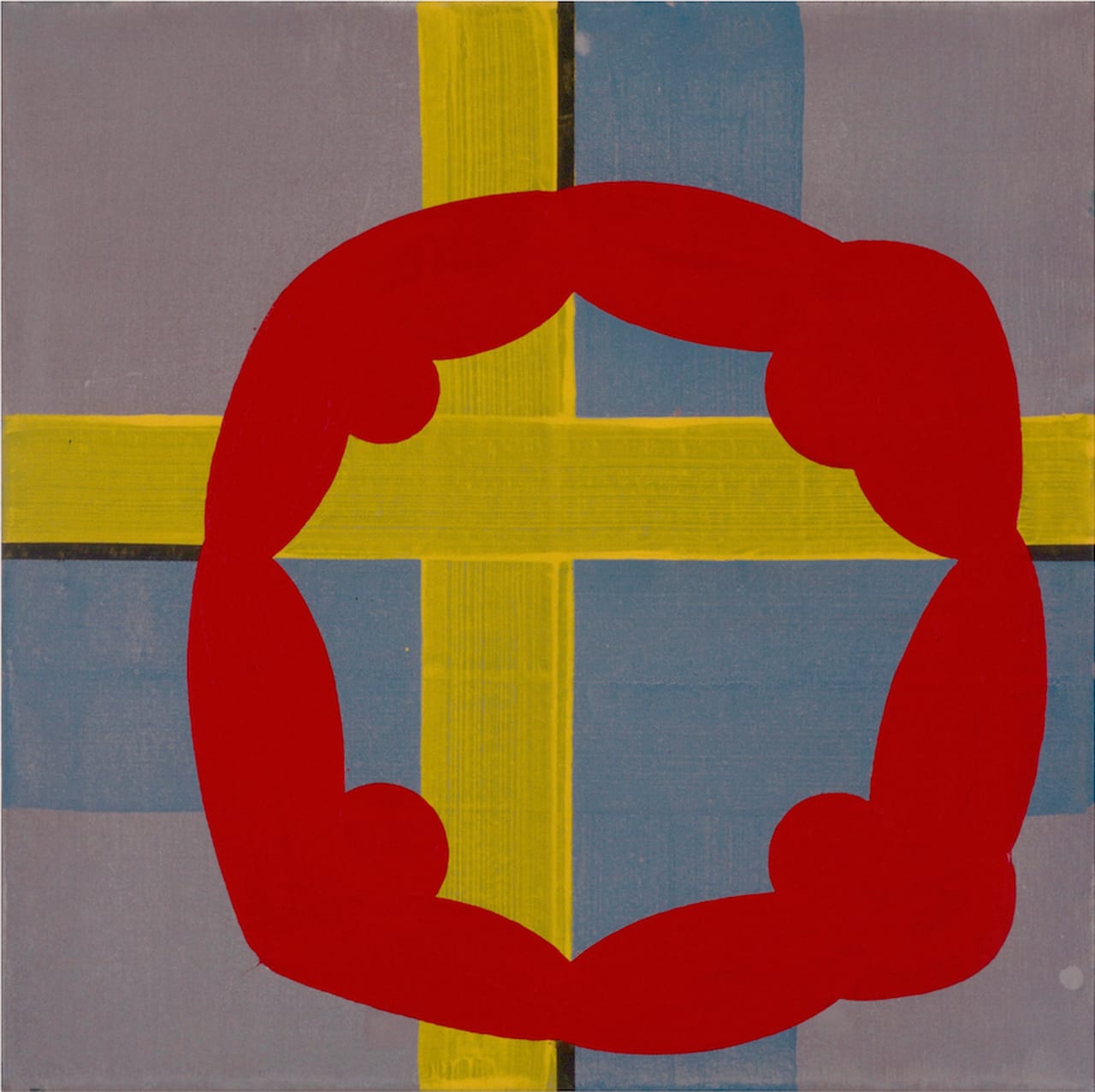 Piet Mondrian was able to achieve this level of singularity with his purist vocabulary, but that was more than 70 years ago. In contrast, Stephan brings together a diverse vocabulary consisting of evenly applied, striated bands; open and enclosed geometric shapes; solid vertical and horizontal bands; cutout and cartoony shapes. The differences are not dramatic or theatrical, but they are evident. Done in acrylic, the mostly muted palette changes from painting to painting. Stephan uses yellow in at least five of the 17 paintings, but it seems just different enough each time.