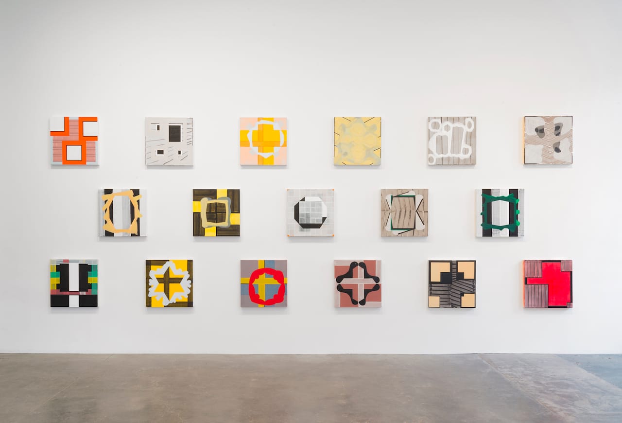You know something is going on when you stare at work hanging on one wall and forget to look at what is on the gallery’s other three walls. This was the case with Gary Stephan in the two-person exhibition, Gary Stephan | Alina Tenser, at Susan Inglett Gallery (March 17–April 23, 2016). Seventeen square, abstract paintings, modest in scale at 20 x 20 inches, are arranged in three staggered rows spanning the gallery’s longest wall. For all the affinities that these paintings share — from the viscosity of the brushstrokes to the overlay of cutout shapes to the recurring geometric forms — they never come across as variations on a theme.