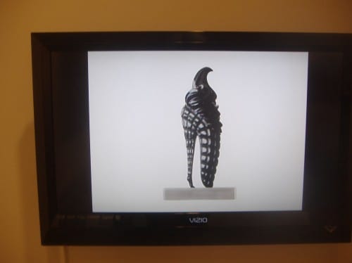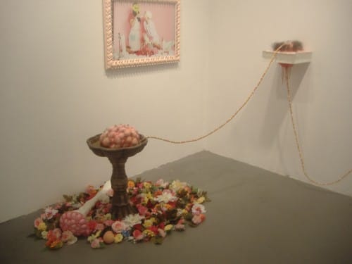 Kikuku Tanaka’s “Deep Core at the Museum on Top of the Mountain (with Dismembered Leg)” (2010) was the most disturbing work in the show. Not pictured, a lamp with little toy birds hung from the ceiling, lighting up the working fountain with fluorescent egg-shaped blob placed in it. Connected to the fountain with an umbilical-like cord is another egg-shaped object called “Visceral Studies #3” (2010) that on closer look is covered with human hair.