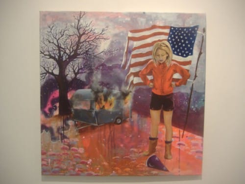 With four works in the exhibition, East Berlin-born Stephanie Homa’s acrylic paintings are heavily represented in Civilization and its Discontents. With their trippy colors and style, Homa’s bizarre paintings are probably the most in line with the theme of the exhibition. In “Magical BBQ” (2011), Homa represents a burning trailer with a tattered American flag in the background while a girl stares at a dropped wizard hat. While I wasn’t blown away by the paintings, I did appreciate the psychedelic colors and sly social criticism.