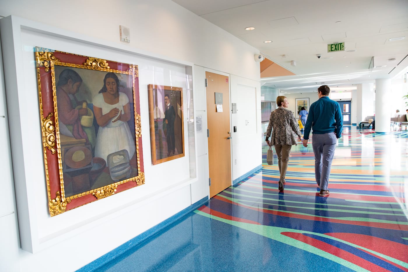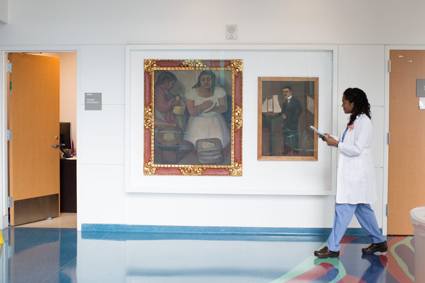 Lange’s referral proved invaluable to Kahlo, and ultimately also fruitful for the San Francisco General Hospital (where Eloesser worked for 36 years). Eloesser owned paintings by both Kahlo and Rivera, which have been displayed in the hospital lobby for 50 years. Eloesser gifted these works to a colleague and close friend, who in turn gave them to the hospital in 1968 with the stipulation that they be publicly viewable. For years, they hung high and barely visible in the lobby; as of a recent renovation completed in 2017, the works now hang prominently at eye level to the right of the guard station.