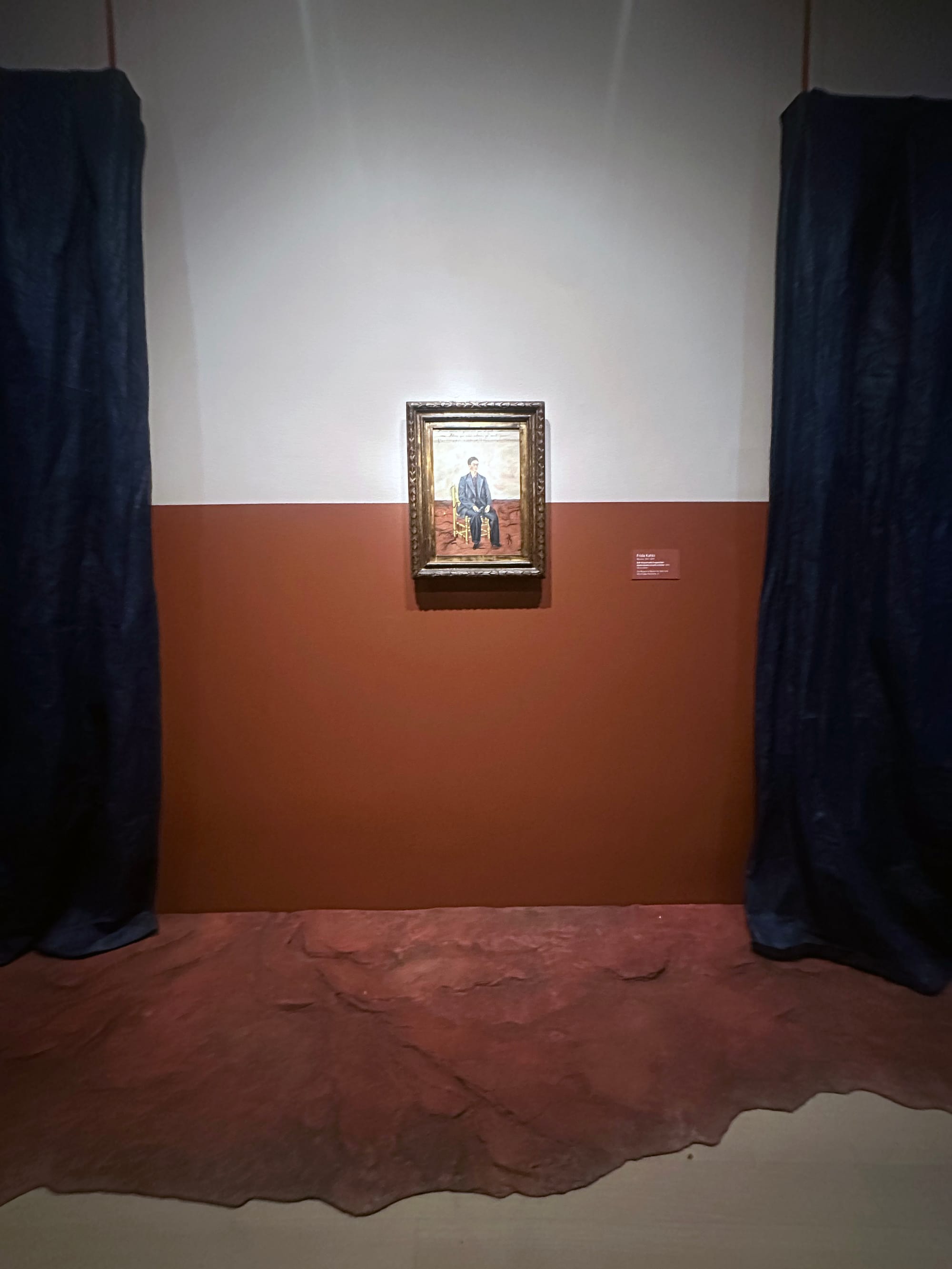 A miniature set model from the opera’s stage design — an eerily lit tree of life emerging from cracked earth with vein-like branches framed by wooden scaffolding and blue tarp walls — greets visitors in the lobby. Coupled with a short promotional video featuring the award-winning production team, idling visitors are effectively marketed the opera before even entering the gallery. Once inside, however, the theatrical design feels misguided. The last thing we need to see in New York City is more cheap scaffolding, even if logically recontextualized as a makeshift memorial for the two artists, with accent lighting befitting an altar. Or to stare at ruffled blue tarp drapes reimagined as a framing device. In one instance, though, the rupture of the oil painting “Self-Portrait with Cropped Hair” (1940) — Kahlo’s post-divorce rebuke of Rivera in which she appears short-haired, wearing a suit rather than her traditional guise — briefly parts the curtained walls successfully for a dramatic effect.