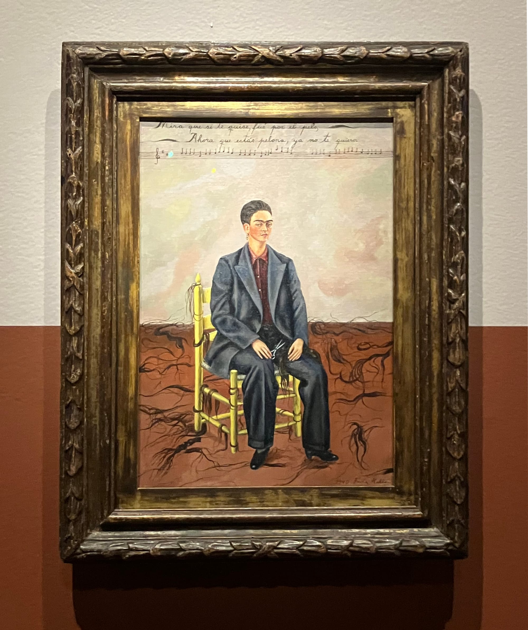 Two views of Frida Kahlo, “Self-Portrait with Cropped Hair” (1940) (photo Néstor David Pastor López/Hyperallergic)