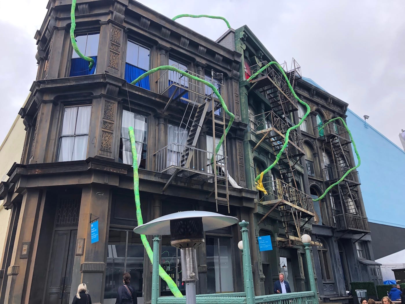 The projects on the backlot “kind of bring art to the center of this city,” said Korek, who hoped they would “help people imagine what our city would be like if that were the case.” She also hoped the “energy from Paramount really emanates throughout the city.” It would probably be better if the energy from the wider and unwieldy city more thoroughly infected Paramount, sort of like artist Trulee Hall’s impressive papier-mâché serpent, which rises out of a fake backlot subway and eagerly wraps itself in and around a dark tenement building.
