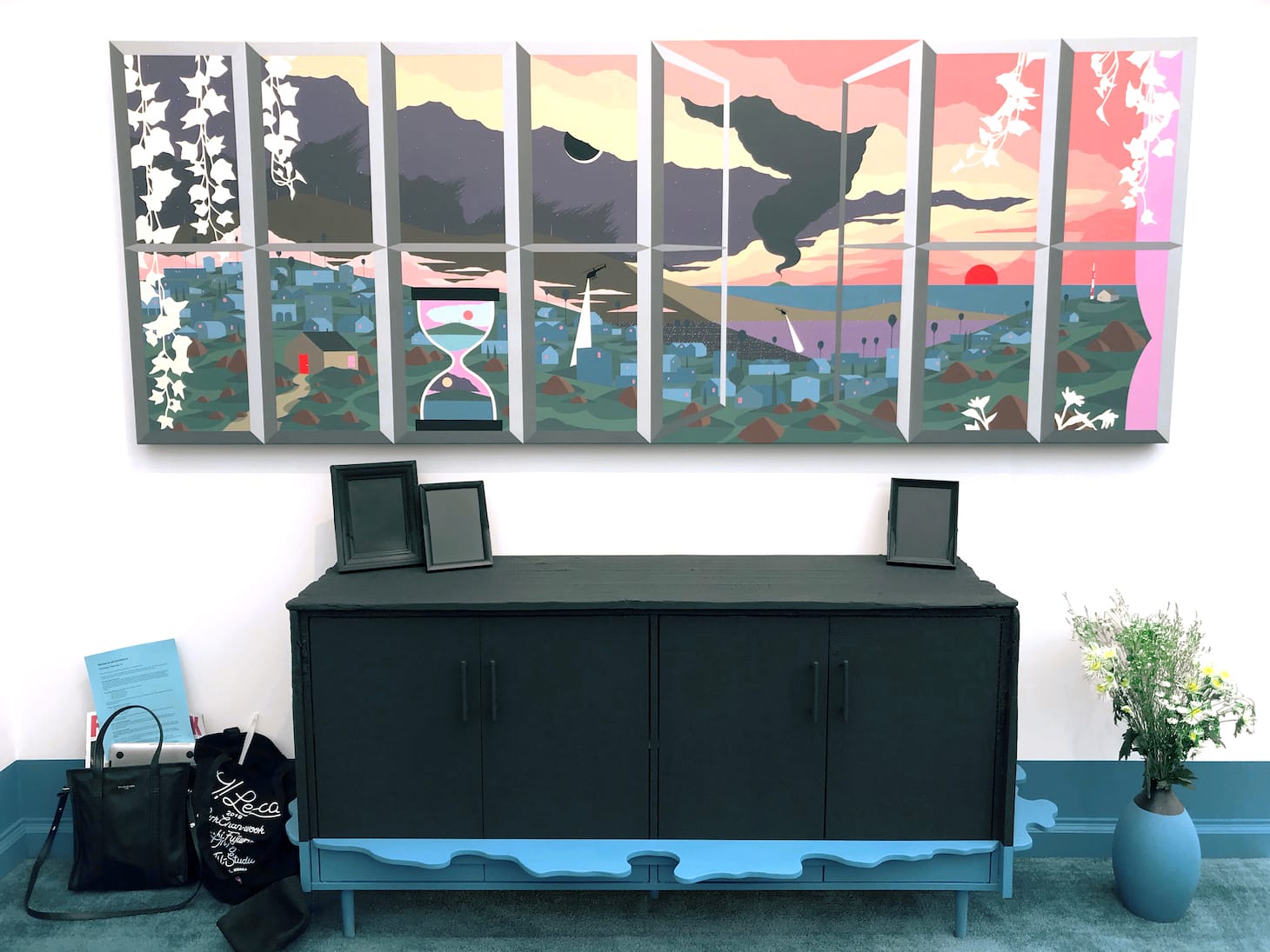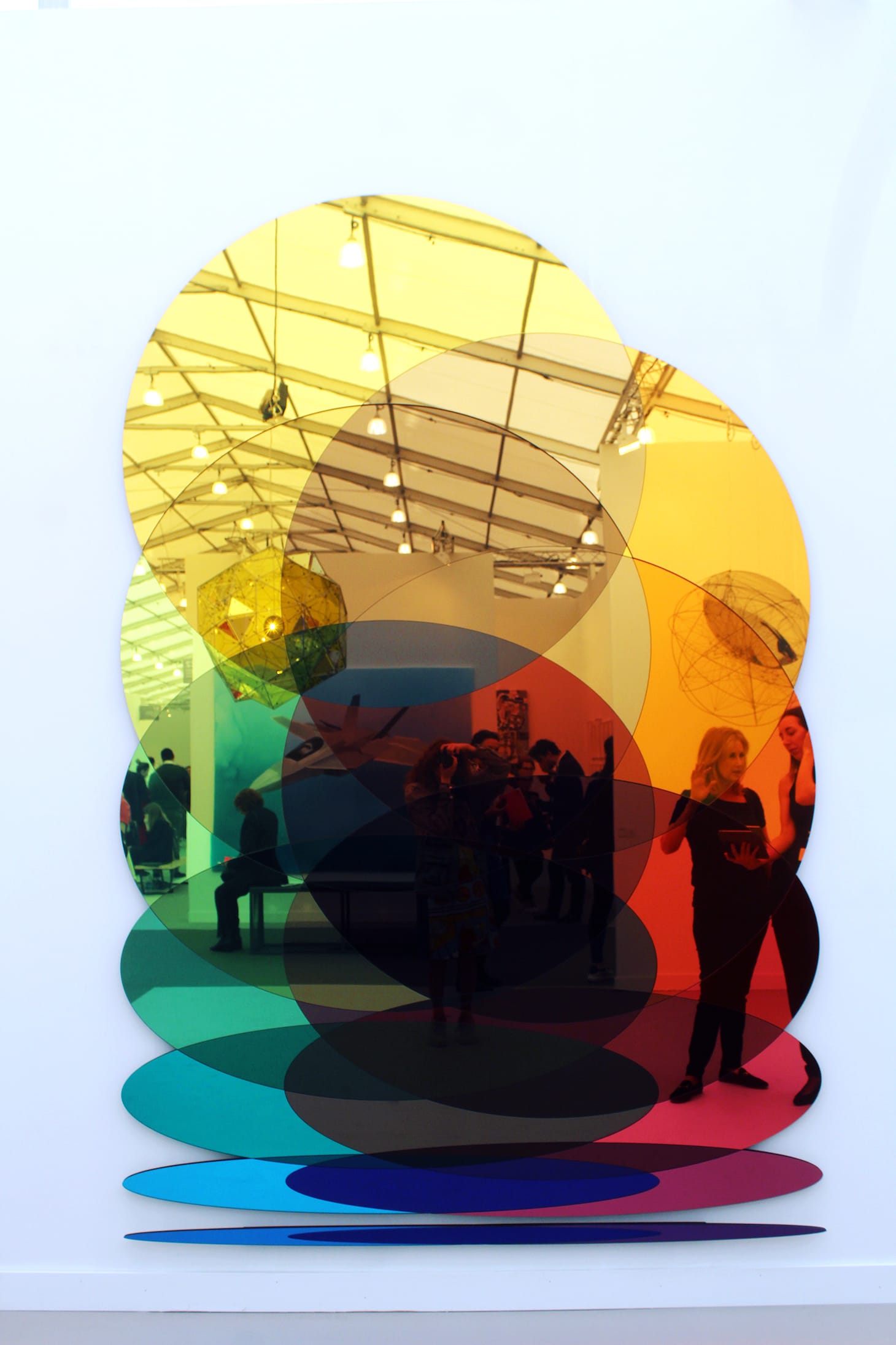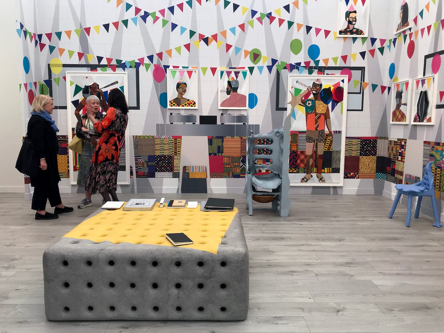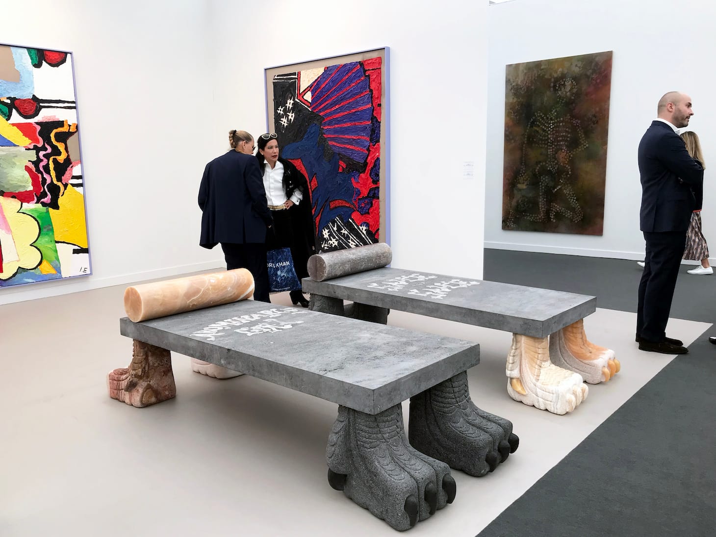 Inside the main tent, colorful figurative paintings, motion works on large LCD screens, and bright neon slogans (“Look at Them Look at Us” cries out a piece by LA-based artist Genevieve Gaignard) compete for attention. Some galleries turn their entire booths into an immersive experience, like at Anat Ebgi, where Greg Ito’s paintings of California wildfires line the walls of a dining room slowly flooding from rising tides that protrude from the baseboards. Other booths, like Tanya Bonakdar Gallery, stuff their space with a wide sampling of who they represent. Bonakdar showed off works from 12 artists, including Olafur Eliasson, Kelly Akashi, and Sandra Cinto.