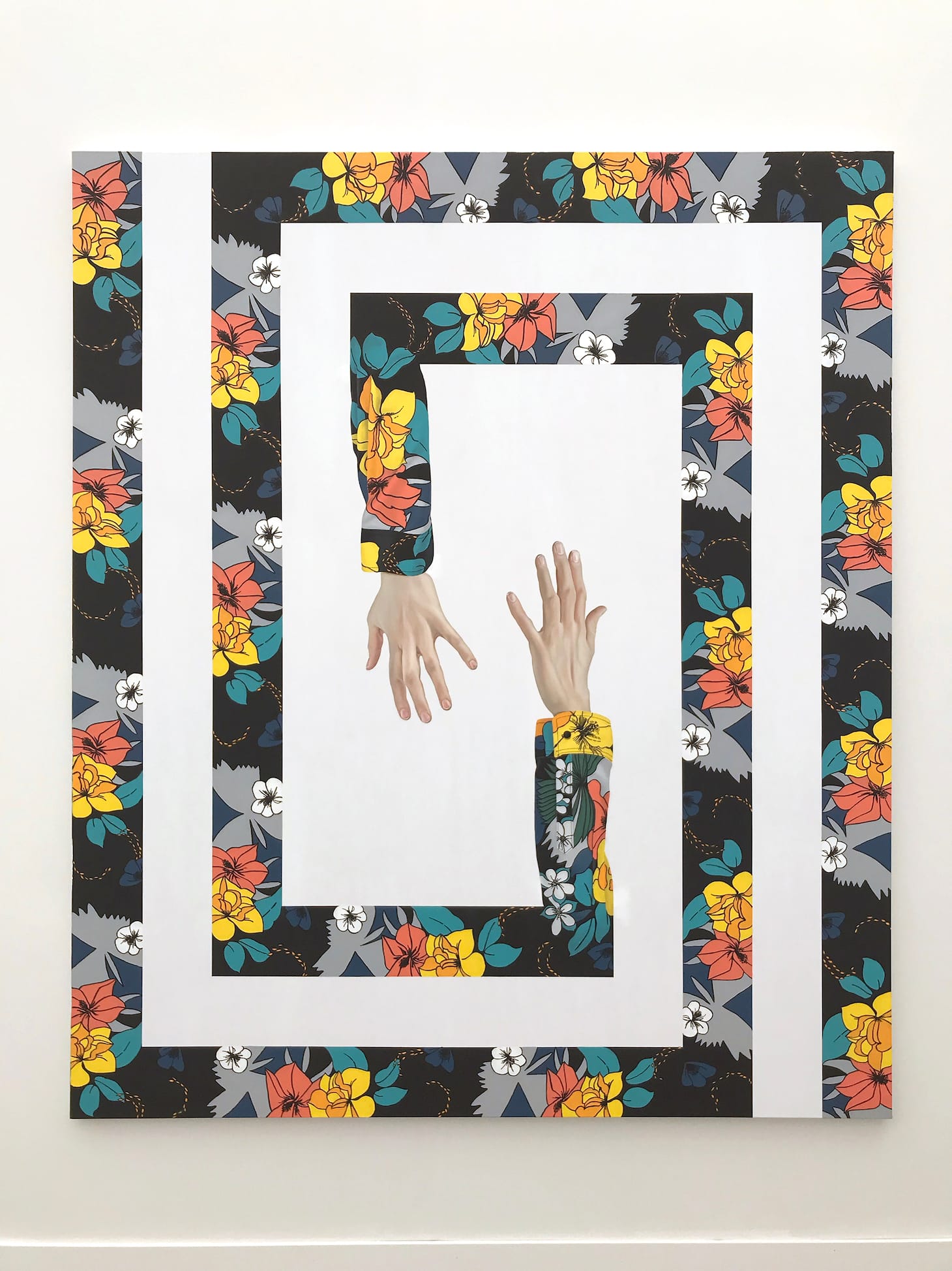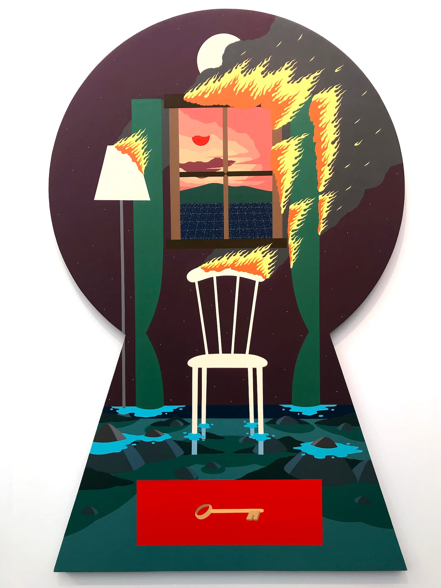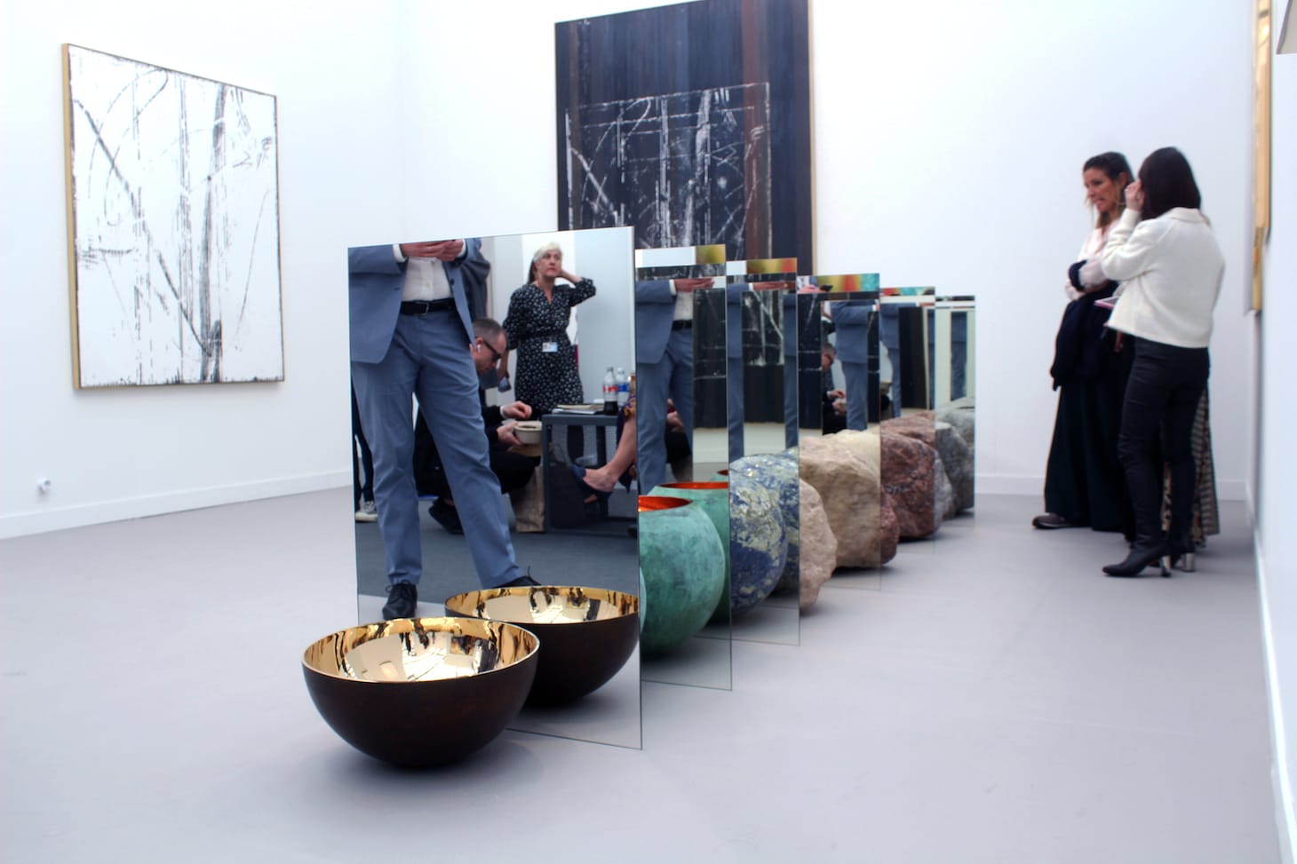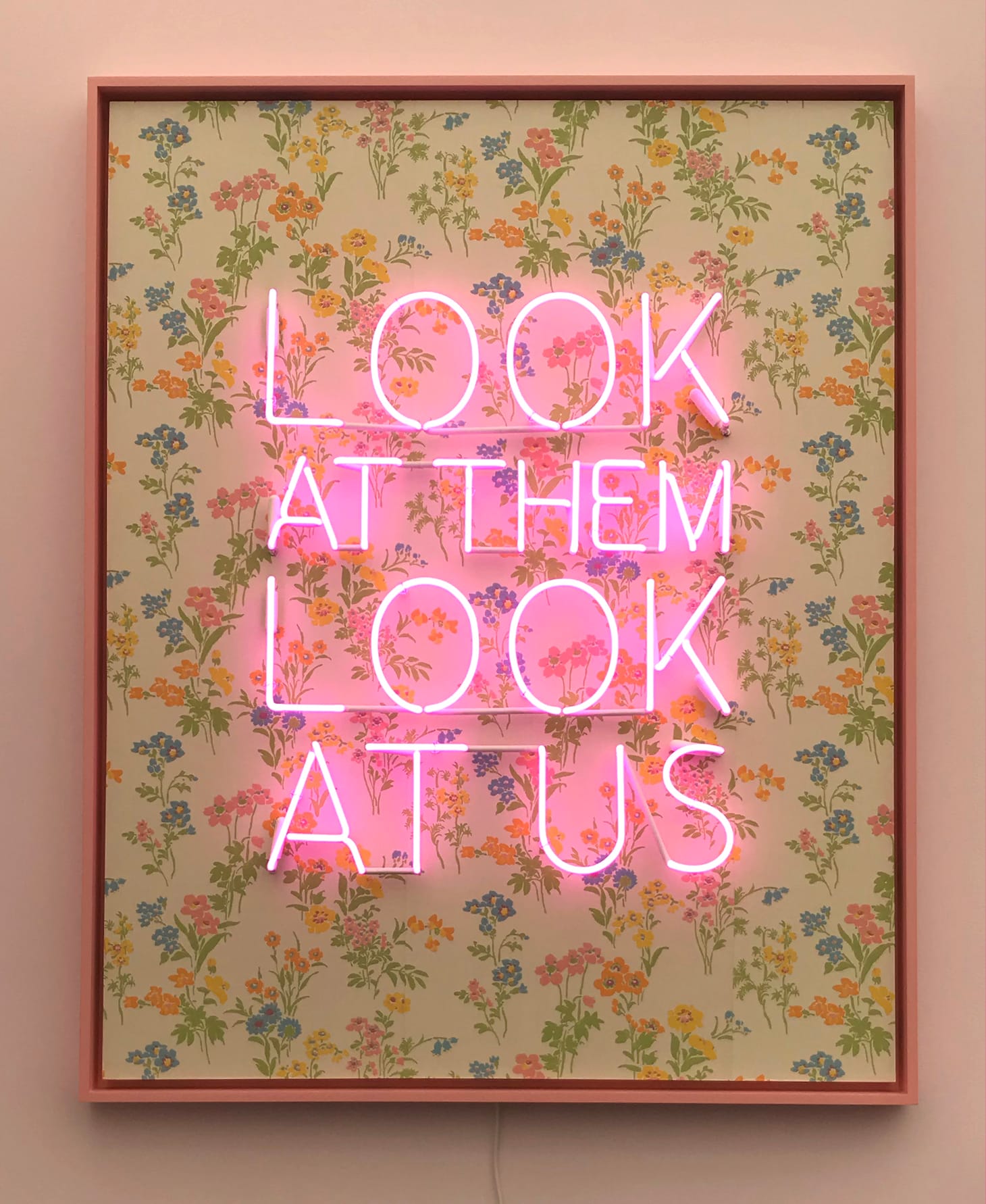 Inside the main tent, colorful figurative paintings, motion works on large LCD screens, and bright neon slogans (“Look at Them Look at Us” cries out a piece by LA-based artist Genevieve Gaignard) compete for attention. Some galleries turn their entire booths into an immersive experience, like at Anat Ebgi, where Greg Ito’s paintings of California wildfires line the walls of a dining room slowly flooding from rising tides that protrude from the baseboards. Other booths, like Tanya Bonakdar Gallery, stuff their space with a wide sampling of who they represent. Bonakdar showed off works from 12 artists, including Olafur Eliasson, Kelly Akashi, and Sandra Cinto.