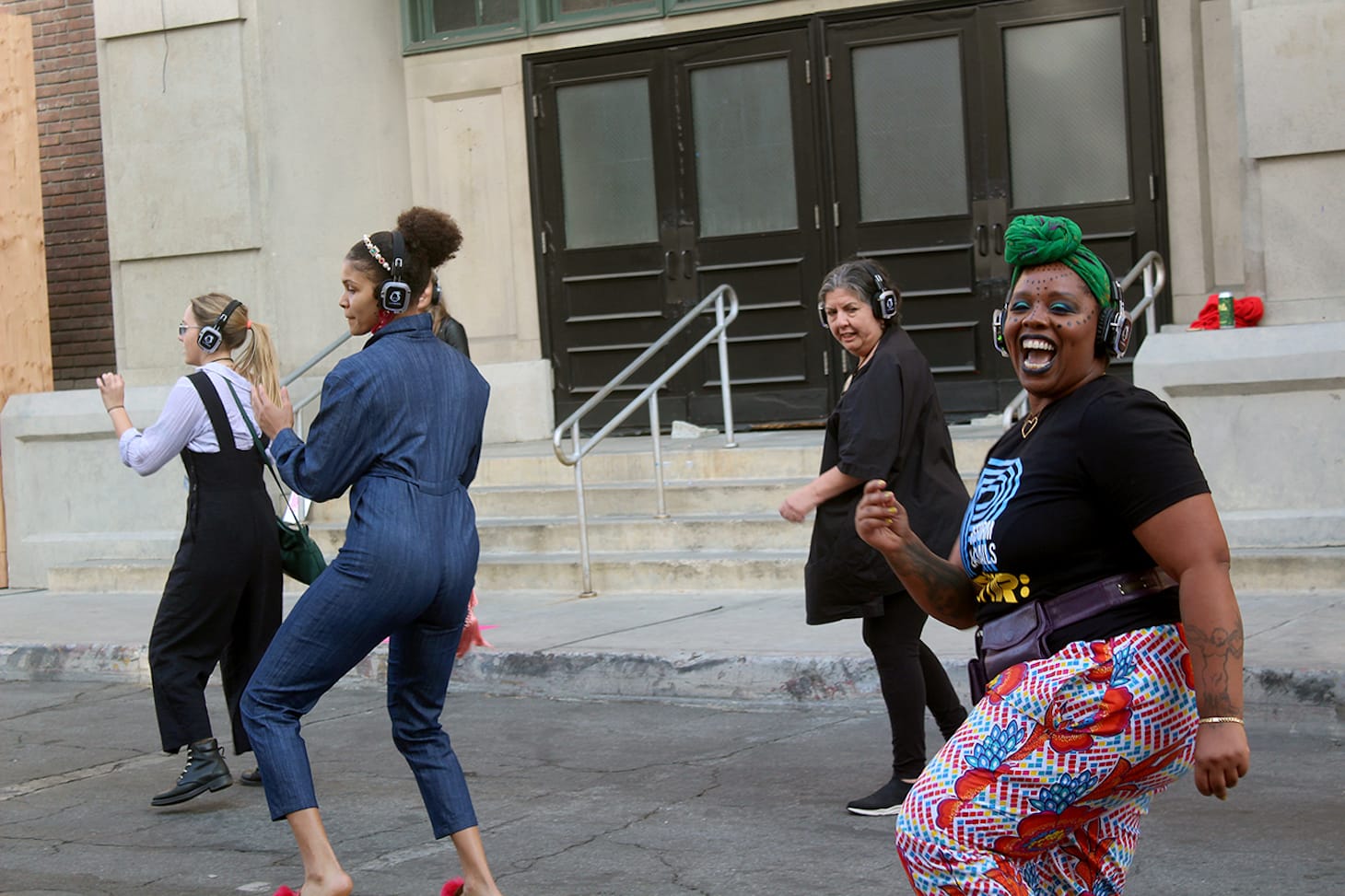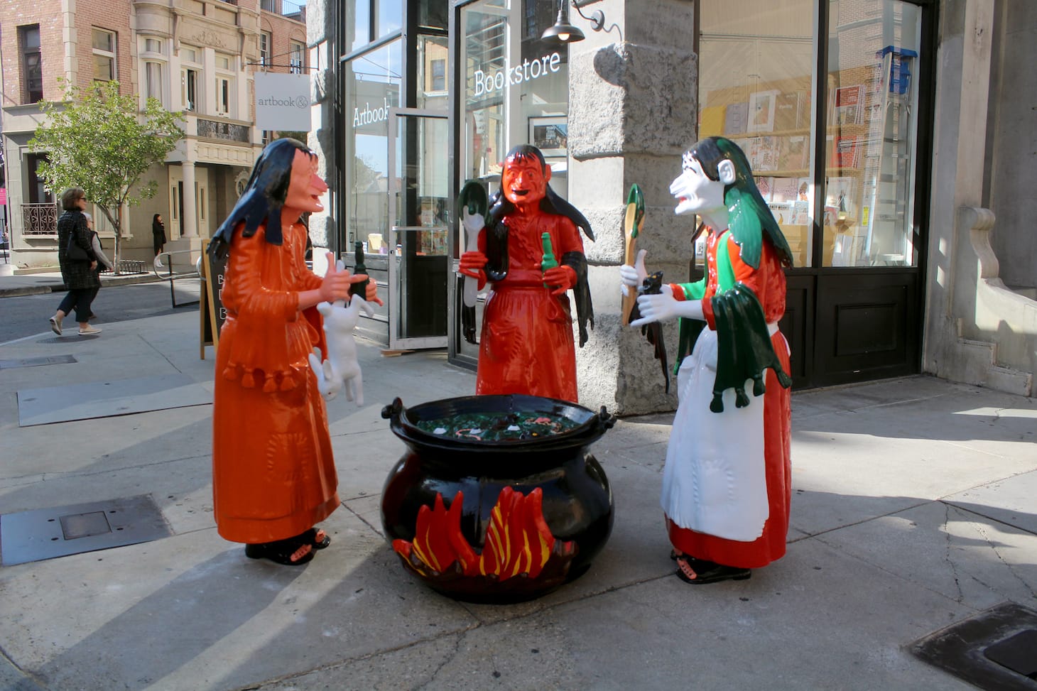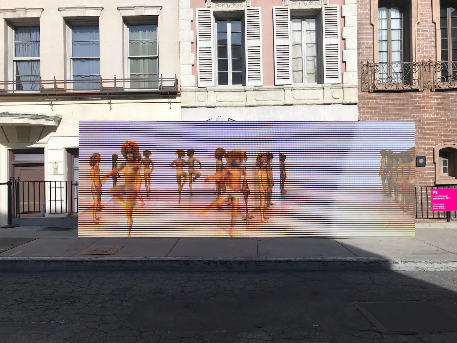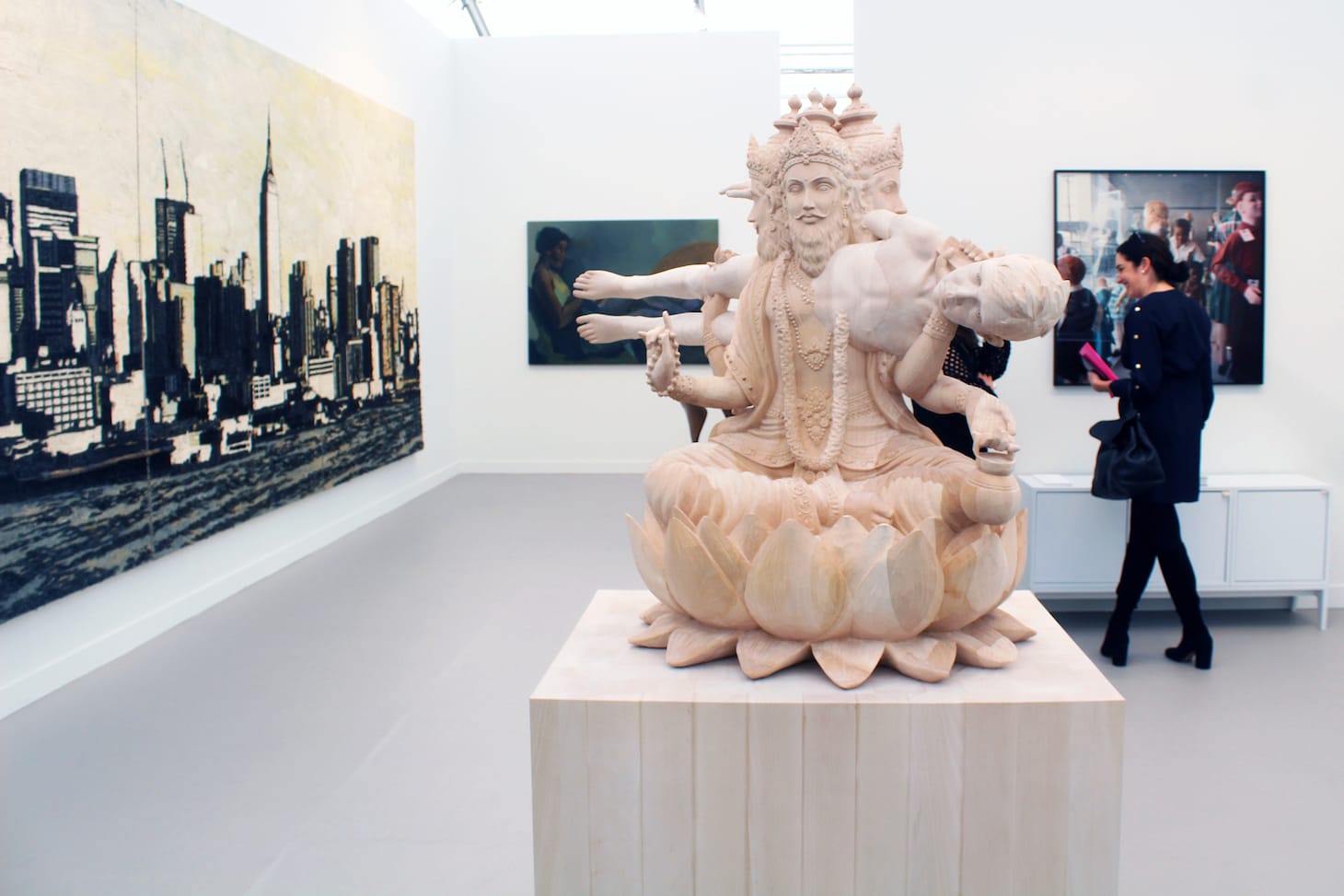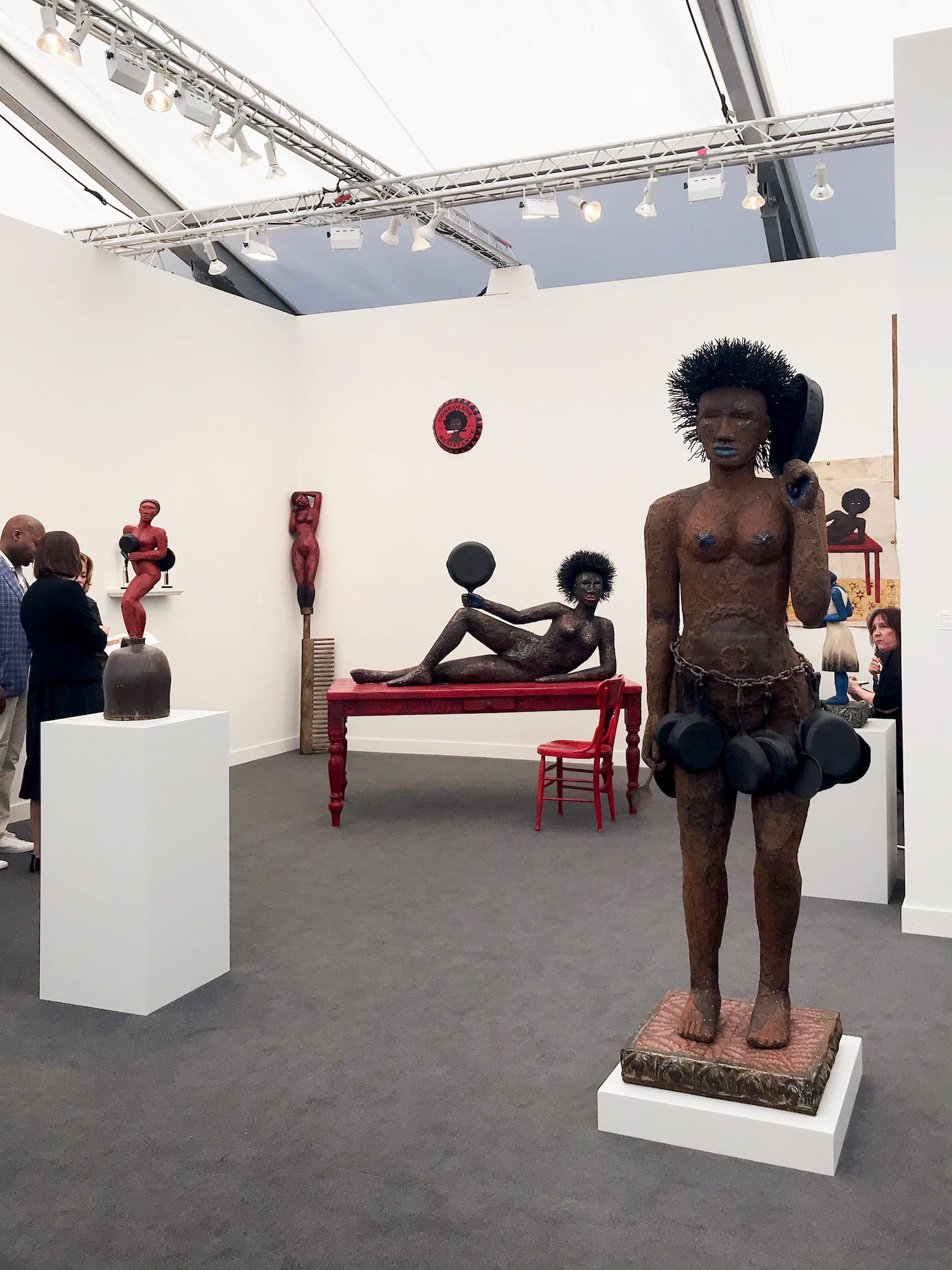 Outside, on the Frieze Backlot, pop-up reading rooms, shops, and bars are moved into Paramount’s brownstones, giving you a rare chance to see New York through the same eyes as Ally McBeal. The backlot’s highlight is Frieze Projects, curated by Rita Gonzalez and Pilar Tompkins Rivas, a set of 18 recontextualized or newly commissioned, site-specific art pieces and performances by 16 artists. Lorna Simpson’s two-channel video installation, “Momentum” (2011), shows Black ballet dancers perpetually spinning, their bodies painted gold like prized Oscar statuettes. Will Boone’s life-sized sculpture, “The Three Fates” (2020), depicts three witches conspiring over a cauldron, their cartoonish figures evoking oversized merchandise from a Disney film. And Patrisse Cullors leads a silent disco, inviting fairgoers to put on synced wireless headphones and side-step to the electric side.