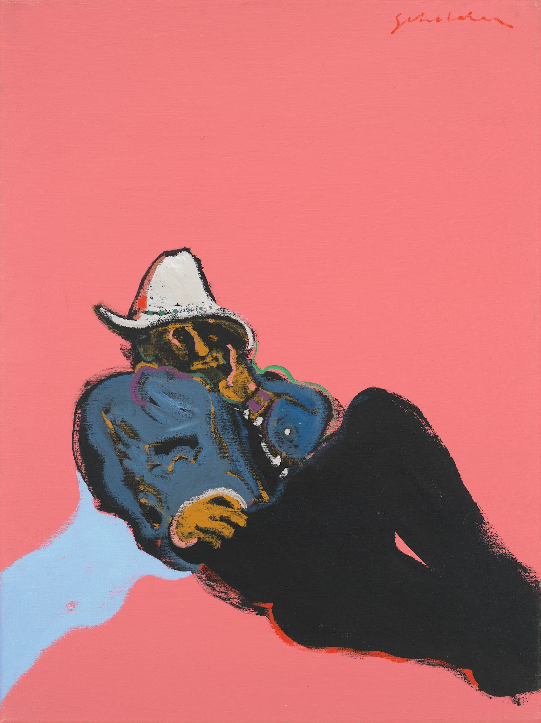 Other subjects include a Native American man in ceremonial regalia carrying an umbrella and a drunken man wearing a cowboy hat, reclining on the salmon-colored ground, with a light blue shadow extending from him. The color infuses the painting with visual incongruities, which reflect the artist’s understanding of his life in relation to concepts of Native American identity and life. He might have been inspired by Pop art, Expressionism, and Op art, but what he did with these stylistic possibilities is very much his own. What comes through in all of his portraits is a deep, jarring feeling of displacement — even within the context of a painting, Scholder realized he couldn’t give his subjects a home.