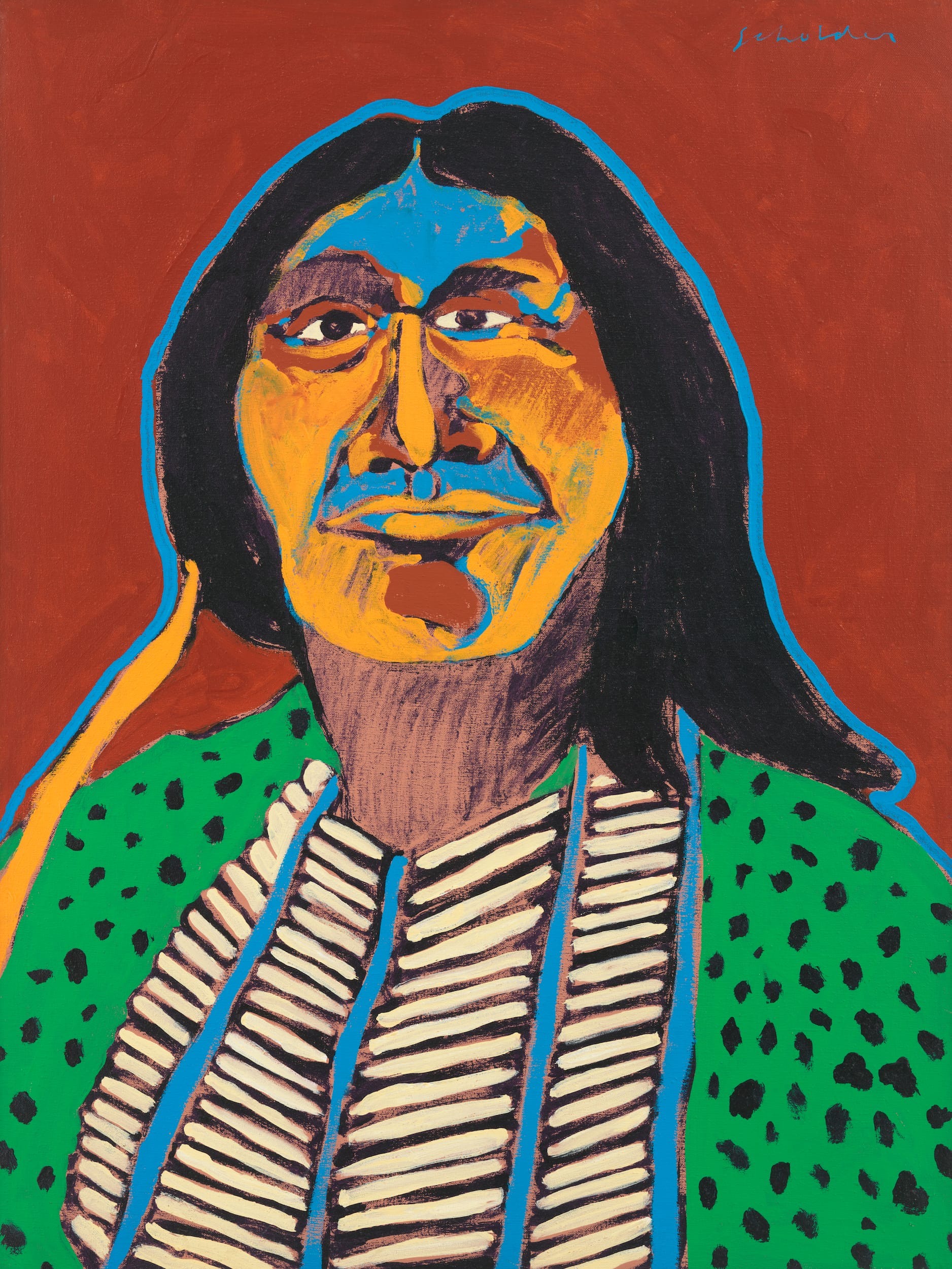In the early painting, “Indian with Blue Aura,” Scholder gives us no context; it is a portrait of a Native American with a blue aura (halation line) edging his long flowing black hair. He is wearing a bone hairpipe (or buffalo horn) vest and a green shirt with black marks over it. Traditionally, this was worn as armor. What century does Scholder’s figure live in? Isn’t that part of the subject? Doesn’t the blue aura and blue marking on his face evoke a mystical experience? Scholder, who studied with Wayne Thiebaud, has transformed his mentor’s use of halation lines to suggest something very different. What about the black dots? Don’t they also convey the exalted state of the man in the portrait?