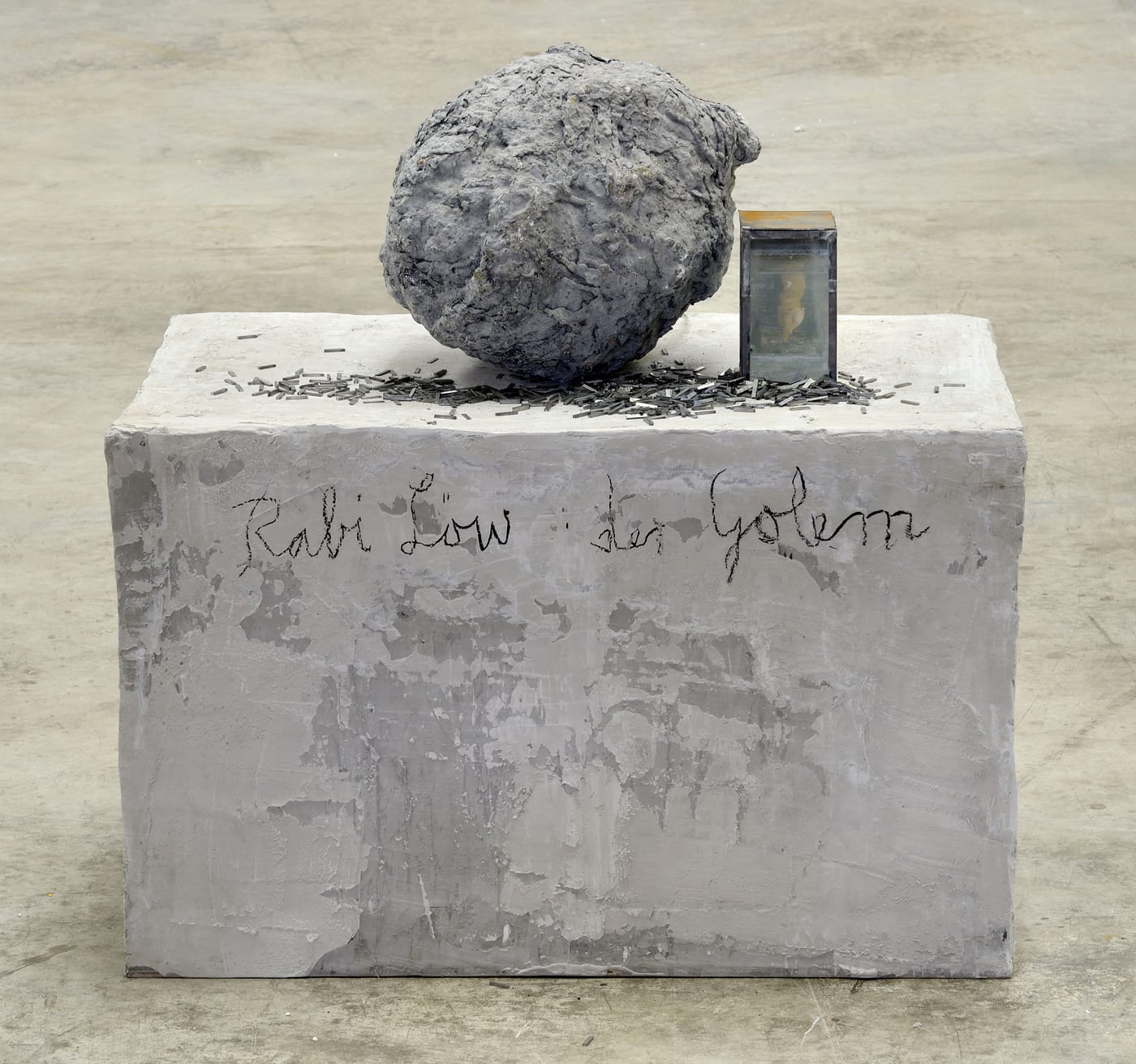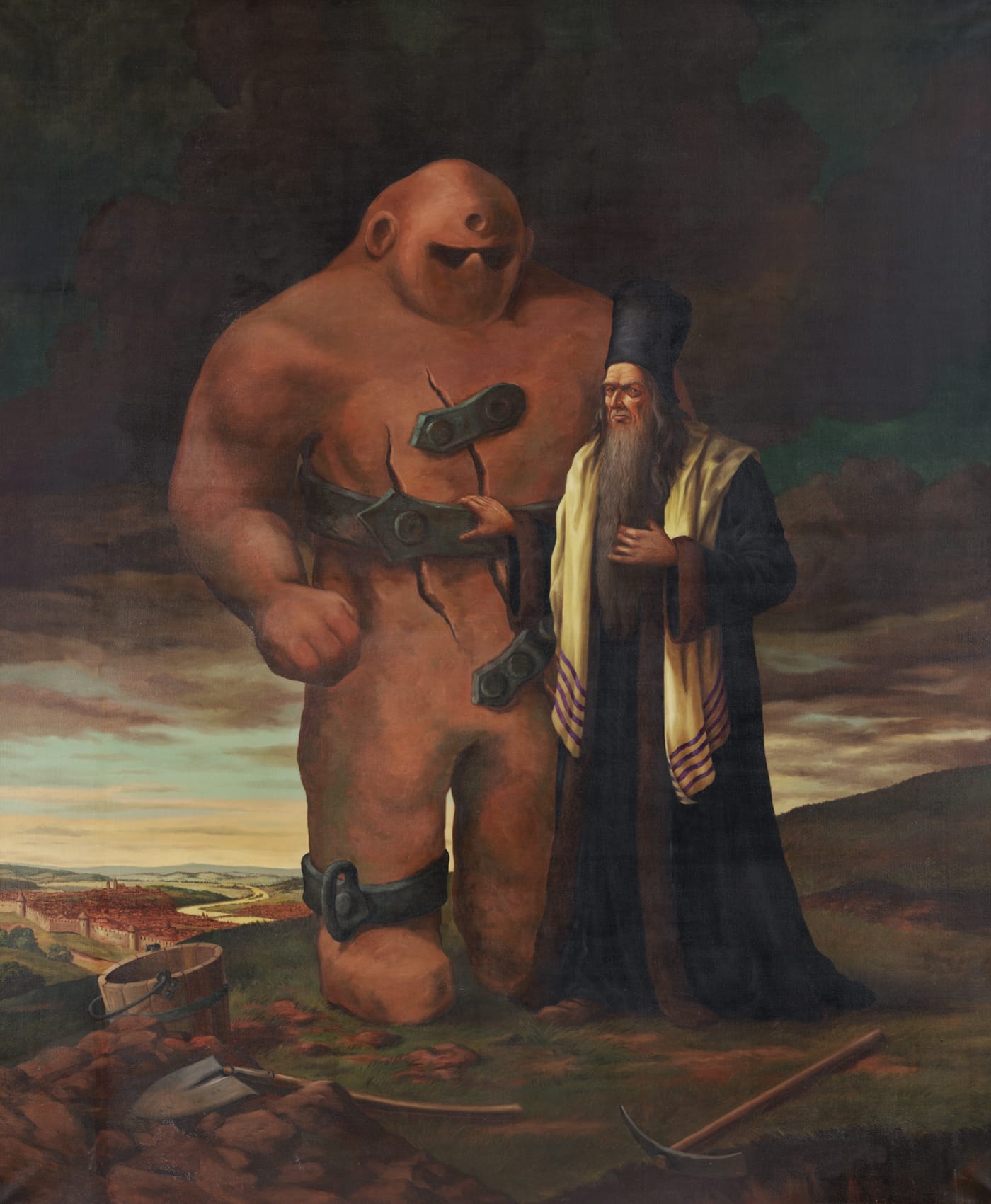 The golem was first mentioned in passing as גֹּלֶם in the Bible in Psalm 139:16, but the first golem story was spun by the 16th-century Talmudic scholar Rabbi Loew ben Bezalel. In it, he supposedly used Kabbalistic magic, Hebrew letters, paranormal amulets, or mystical incantations to conjure into existence the Golem of Prague: a colossal figure built from mud or other base materials, who protected the Bohemian Jews of the country from the Holy Roman Emperor Rudolf II. Though initially a savior, the Golem of Prague eventually became harmful to those he had saved and had to be destroyed. There are myriad subsequent versions of the story, with many variations and contradictions. It is generally agreed that what animated this mystical entity was an inscription either applied to its forehead or slipped under its tongue, and the golem has largely been understood to be an artificial man that is part protector and part monster, but many other differences abound. This specious aspect makes the golem particularly interesting to artists because such contradictory vagueness yields opaque and elusive visual iconography.