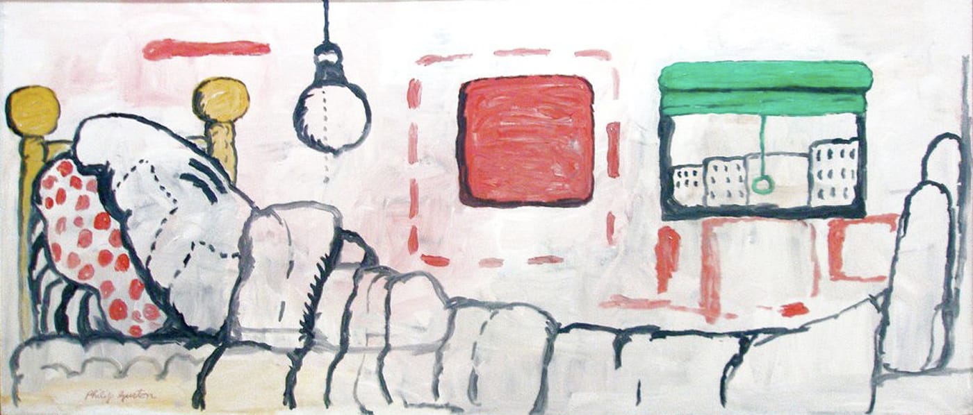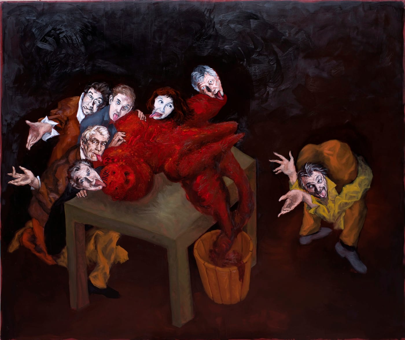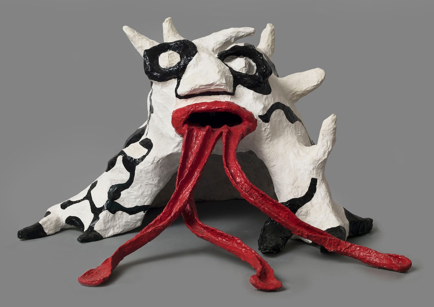 The show kicks off with a large straightforward illustrative painting by Miloslav Dvořak, “Le Golem et Rabbi Loew près de Prague” (1951) but soon turns weirder with a 1964 Dennis Hopper photograph of the great beatnik Wallace Berman. Berman is known for his underground film Aleph (1956–66), in which he uses Hebrew letters to frame a hypnotic, rapid-fire noise montage into a bit of wonder. Moving on, I was fascinated by an odd printed book page from the Sefer Yetzirah (Book of Creation) (1562), in which Kabbalists, wishing to bring a golem to life, looked for the aid of alphabetic formulae. Other powerful pieces include Lionel Sabatte’s redolent sculpture “Smile in Dust” (2017), Philip Guston’s cartoonish painting of a cuddly Ku Klux Klanner “In Bed” (1971), Anselm Kiefer’s crusty stout block “Rabi Low: Der Golem” (1988–2012), Antony Gormley’s rusty condensed sculpture “Clench” (2013), and Niki de Saint Phalle’s swashbuckling “Maquette pour Le Golem” (1972), her model for the architecturally scaled triple-tongued monster slide “Le Golem” (1972), which she built in Jerusalem, that represents the three monotheistic religions plummeting from a golem-monster’s merry mouth.