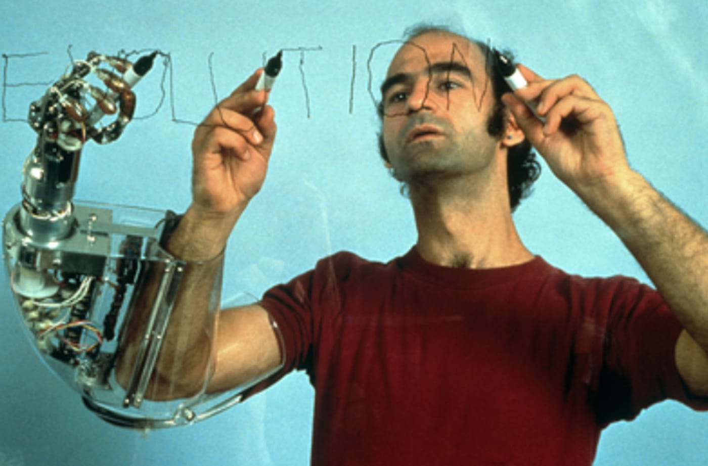 The show winds down wonderfully with Walter Schulze-Mittendorff’s sculpture “Robot from Fritz Lang’s film Metropolis” (1926), which was recreated by the Louvre in 1994, standing in front of Stelarc’s “Handwriting: Writing One Word Simultaneously with Three Hands” (1982). The combination of these works suggests that golems have to do with an abiding conviction that cold and inert matter may be brought to life through the correct application of words. But rather than a sign of human accomplishment, the golem casts a sour shadow onto our gleaming technological age. The power of human language to summon golems to artificial life is experienced as hubris in this exhibit. This vanity enhances the sexy love-hate of spooky computer-robotics we feel at the root of Alex Garland’s 2015 film Ex Machina, a poster for which is on display. We cannot and do not escape the triumphal attraction of the golem here, as we are confronted (again) with the fetid fact that a determinative force in human life is the virtual merging with the actual. As such, the golem is the minotaur at the heart of our viractual labyrinth.