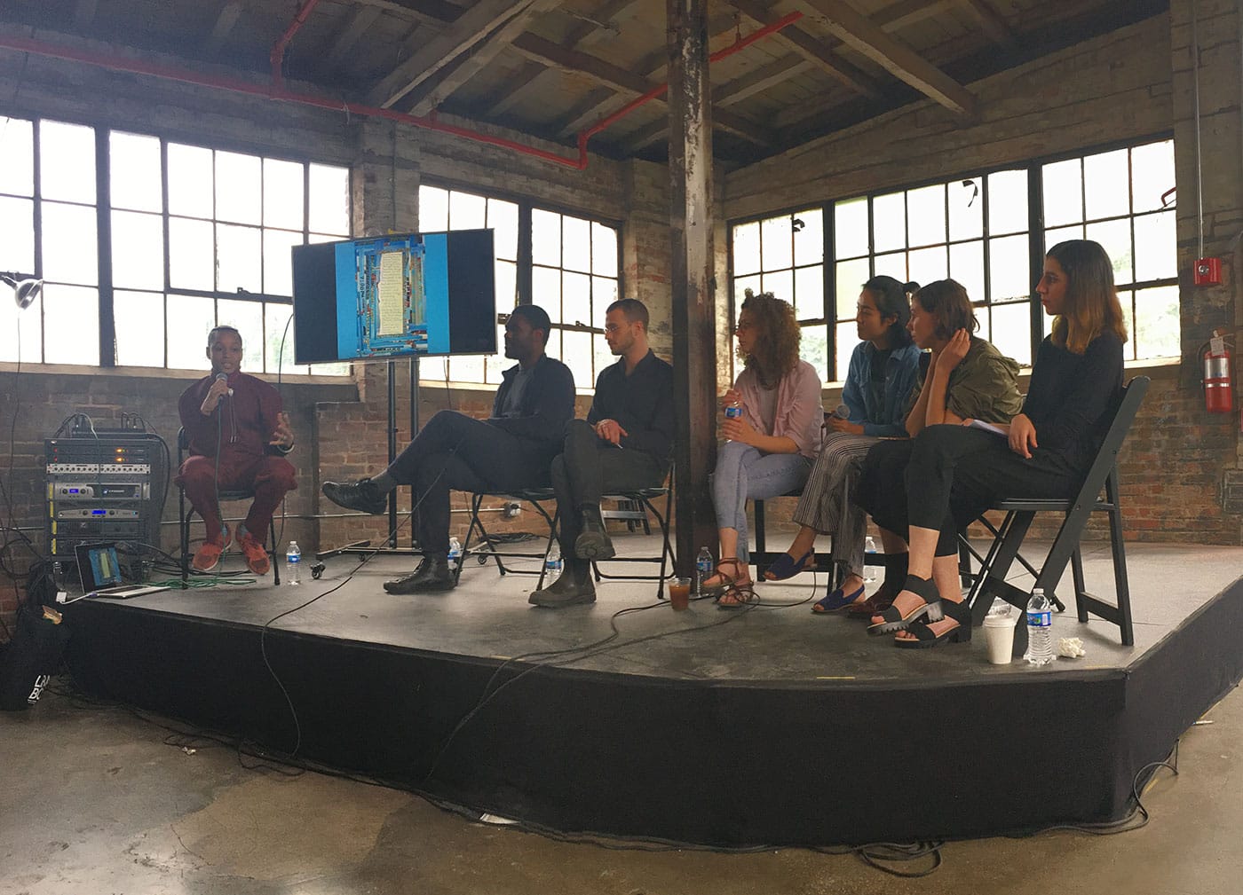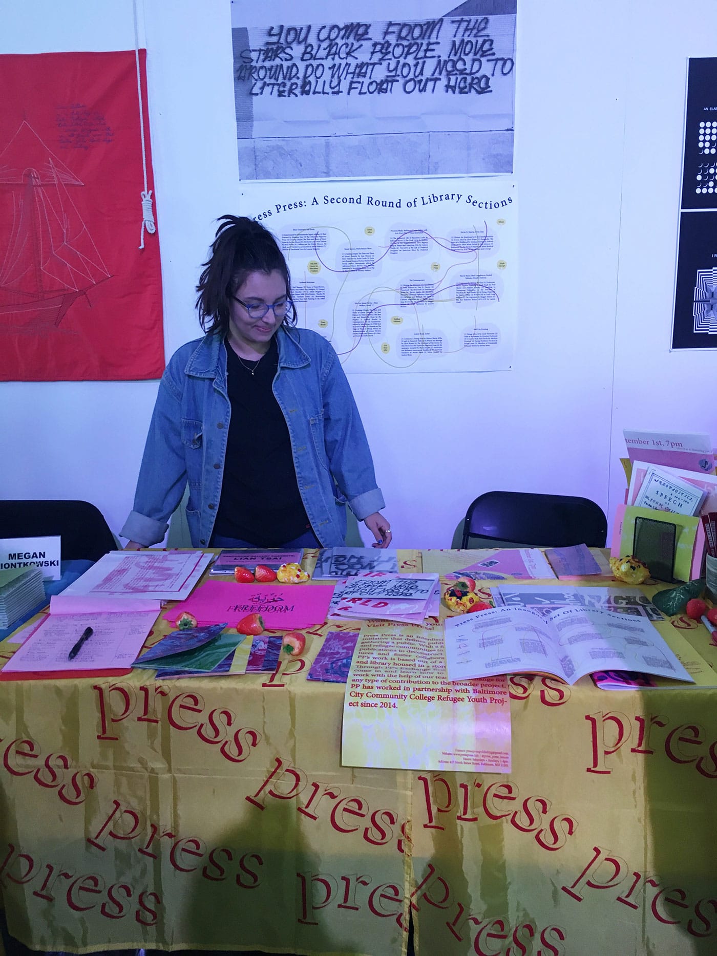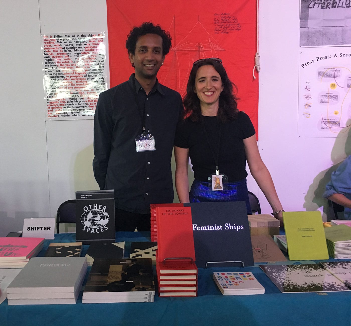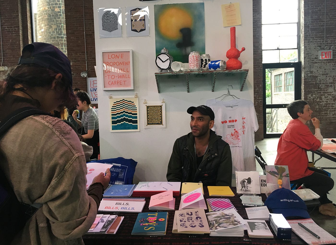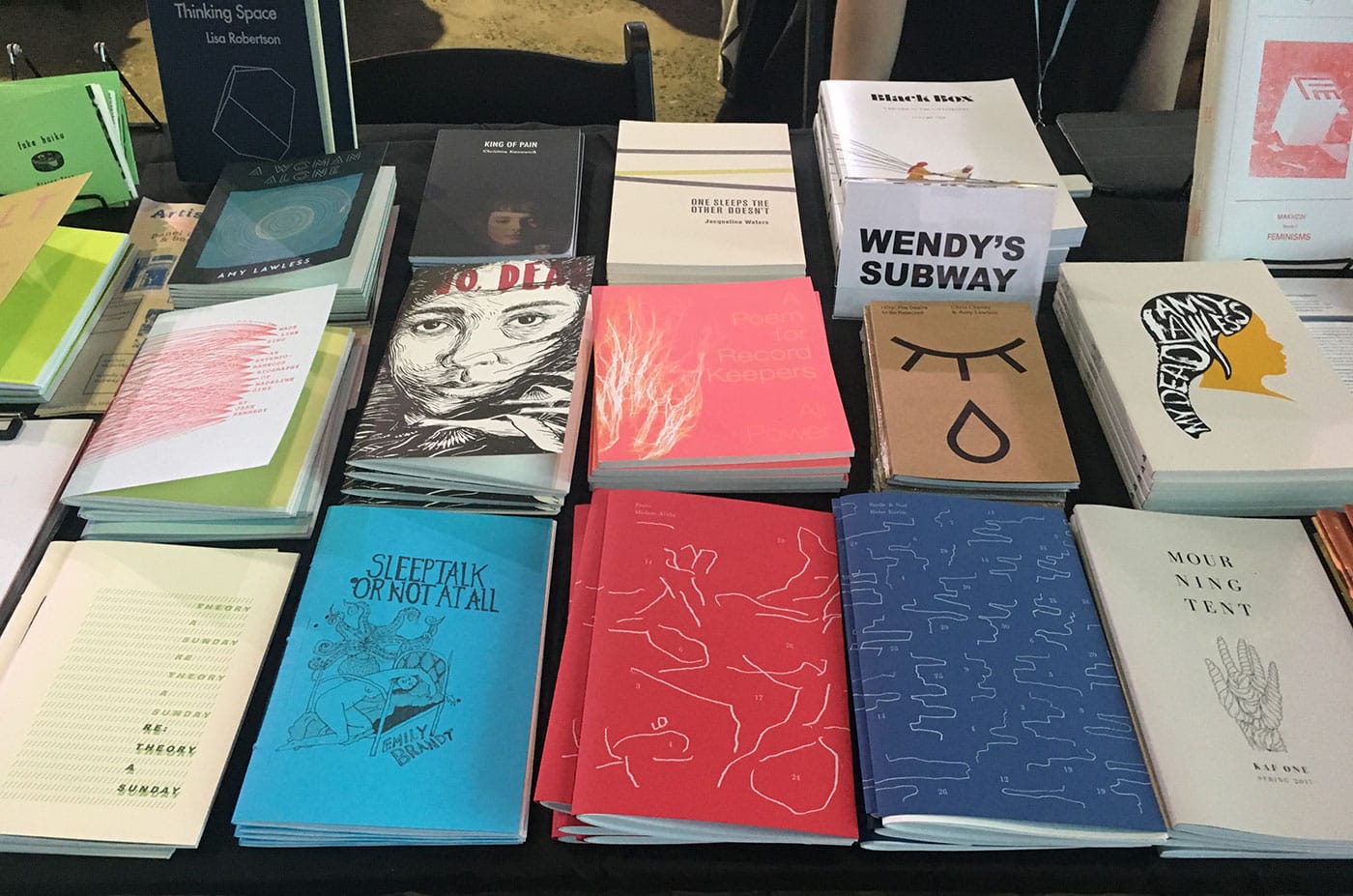 We’re living in a moment of high interest in book fairs, especially art book fairs, and it’s not always clear what newer events have to offer. Although I enjoyed past editions of BABZ at its previous location, Bushwick’s SIGNAL gallery, a much smaller venue with little to no natural light, it looks as though the Knockdown Center holds part of the answer. BABZ isn’t alone in emphasizing small presses and independent publishers and makers, but many other book fairs section off their exhibitors; Printed Matter’s NY Art Book Fair, for example, has grown in size so much that it places the zines in an outdoor tent, the small presses in another room, and the vanity presses in yet another. Walking into BABZ, I encountered three established Brooklyn-based literary presses in a row — Ugly Ducking Presse, Litmus Press, and Belladonna Series — followed by #Blkgrlswurld Zine, a women-run zine/Tumblr celebrating metal and Afropunk, and the feminist publication Ginger Magazine. The grouping placed bound poetry collections and letterpress broadsides in conversation with stapled zines, brightly colored risograph posters, and glossy magazines. Due to the size and limitations of space, most fairs don’t allow for such fruitful juxtapositions between exhibitors. The vast openness of the Knockdown Center meant that nothing was really cordoned off from anything else. The programing occurred in a large, open room connected to the main space, with bean-bag chairs scattered across the floor and picnic tables for visitors to eat or work on laptops. There was one room with a closed door where more formal panels took place, but even that maintained the casual community ethos of the entire fair.