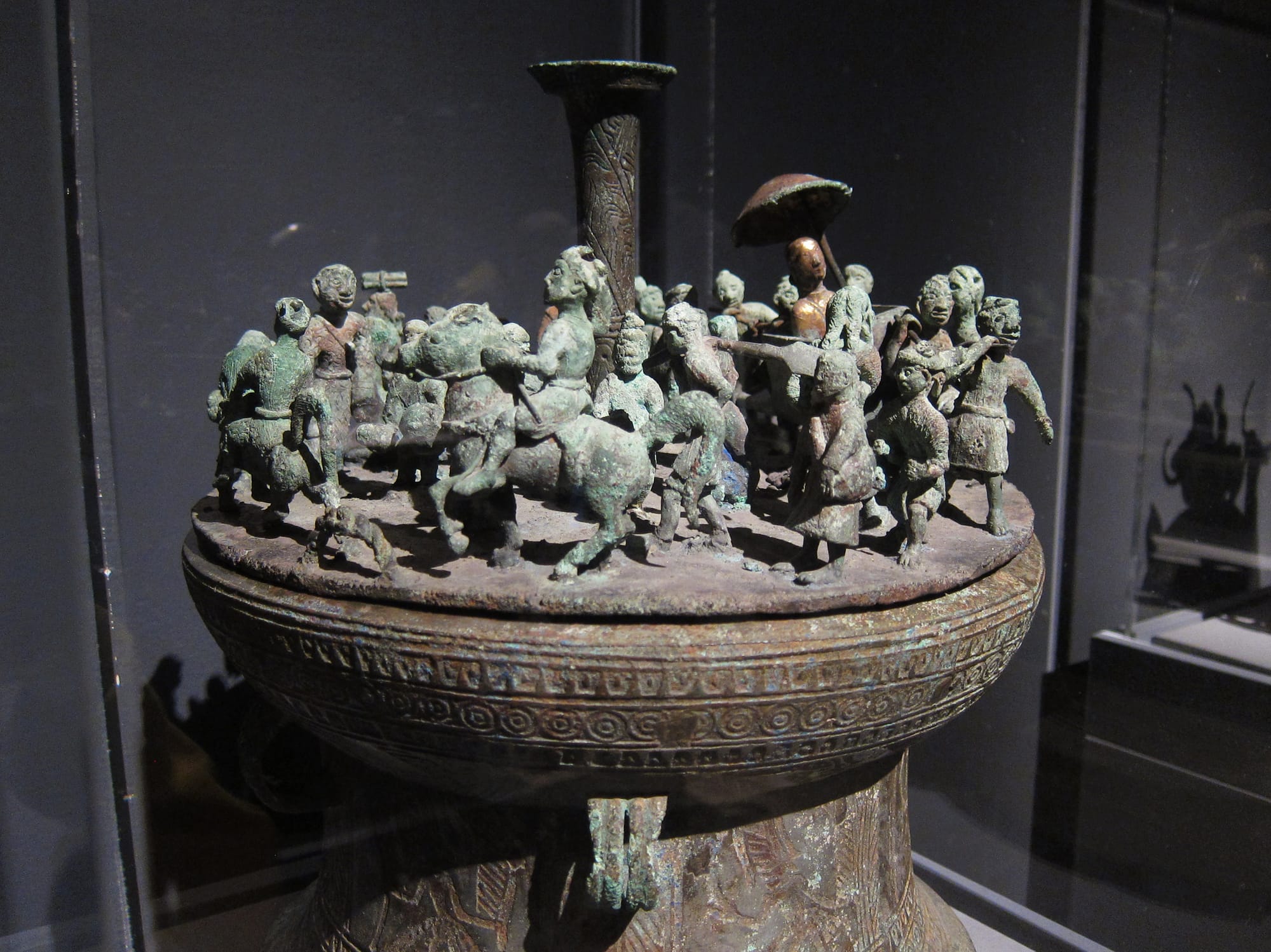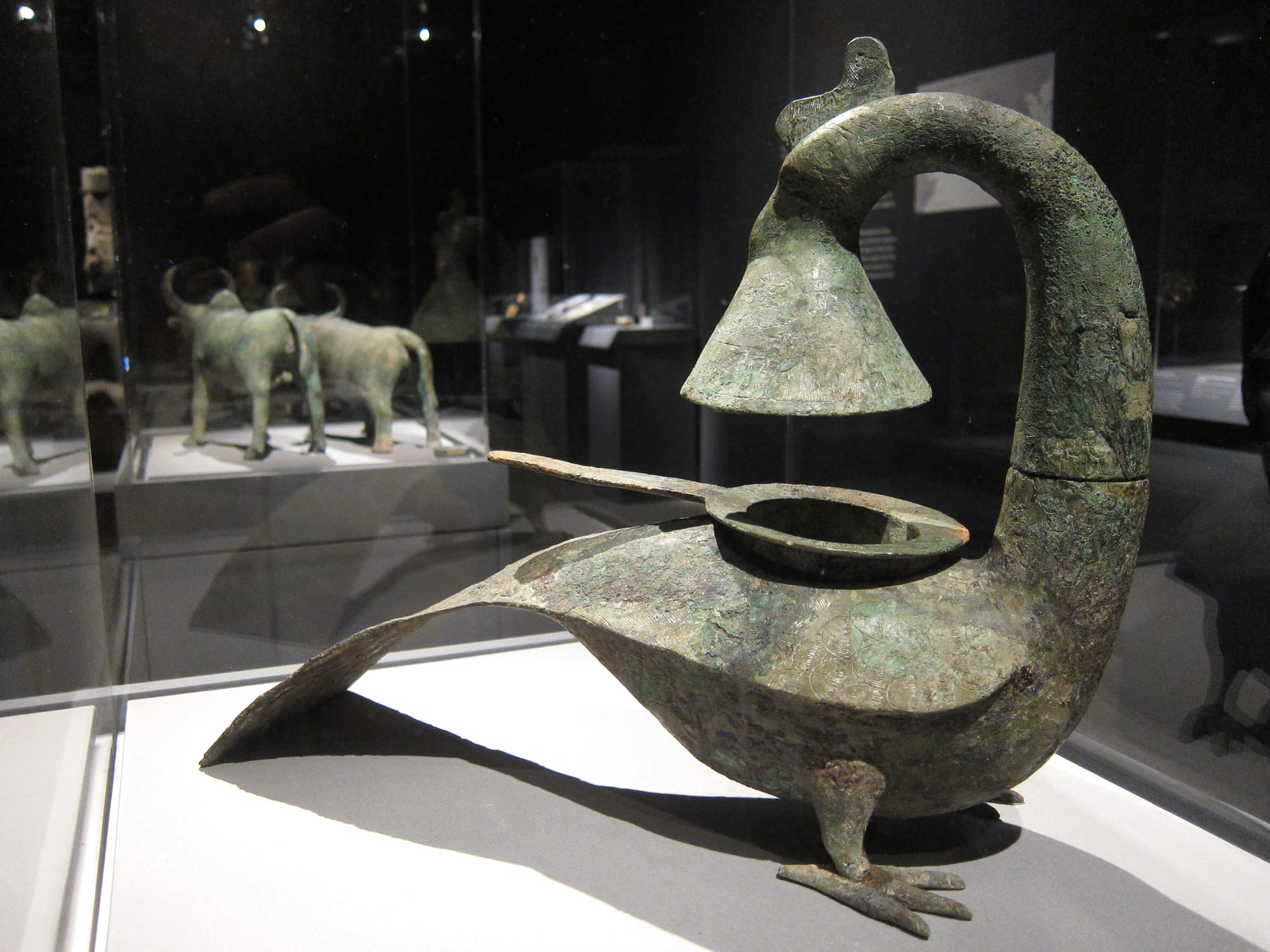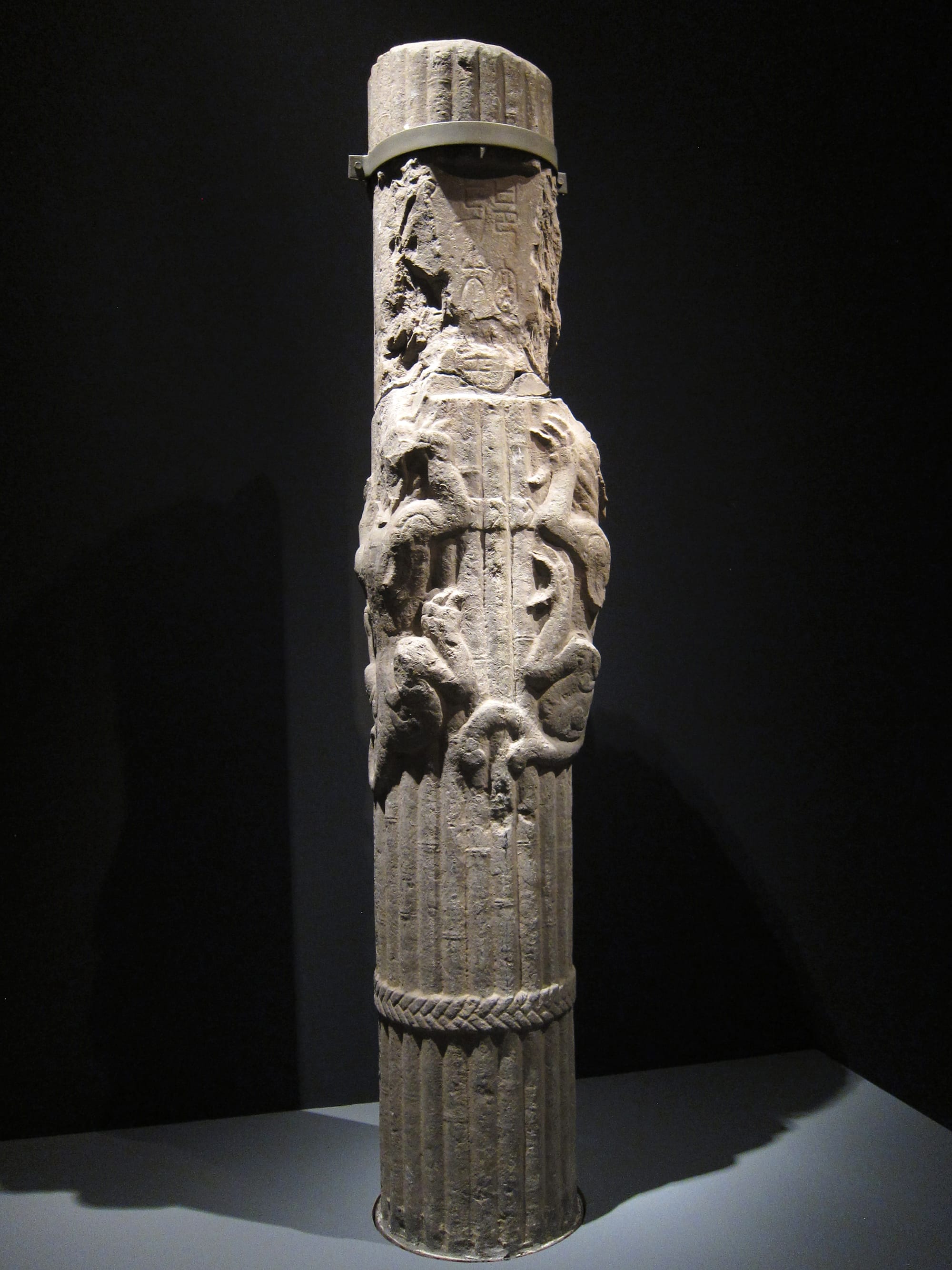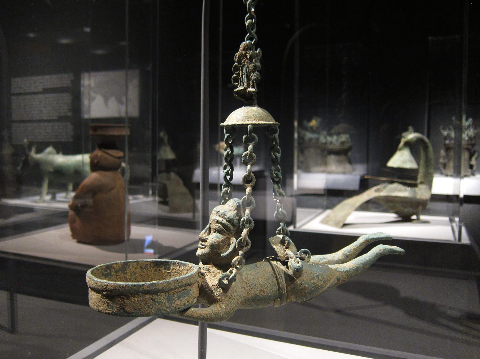 While the Han developed and honed the imperial policies established by the Qin at home, it was busy engaging beyond China’s borders as well. Some of the most intriguing artifacts on view speak to the growing trade networks that resulted from the Han’s military and diplomatic campaigns. Beautiful objects integrate precious materials from places such as Persia, India, and Sumatra, while other artifacts reveal foreign influences more explicitly: for instance, the unique mix of culture in a Hellenistic fluted stone column that bears a Chinese inscription. Then there’s a comical lamp with a fuel chamber shaped like a Southeast Asian man, who hovers in the air, attached to chains — a design borrowed from the ancient Mediterranean.