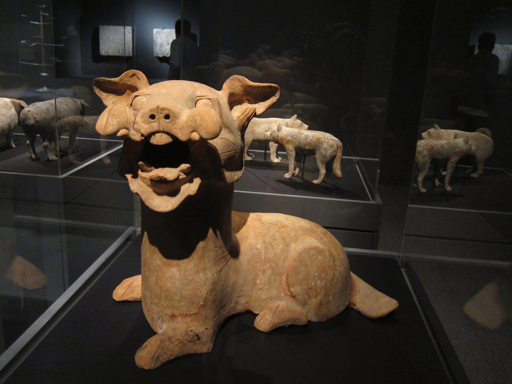Mausoleums were built as extensive replicas of real-world residences, so most of the objects in Age of Empires are more quotidian in nature. Their occupants spared no expense, however, ordering artisans to create lacquered tableware, skillfully woven silk textiles, furnishings that boast intricate metalwork. Smaller versions of buildings stood in funerary complexes, too, as models of grand homes that conveyed an owner’s status and power. One luxury, multistory structure is so realistic, it even has a tiny guard dog sitting by its entrance. Animals themselves were popular subjects for standalone works. Some species were considered auspicious symbols, while others represent the exotic creatures that populated imperial zoos. An entire gallery at the Met is filled with animals, from elephants to cows, sculpted in a variety of materials.