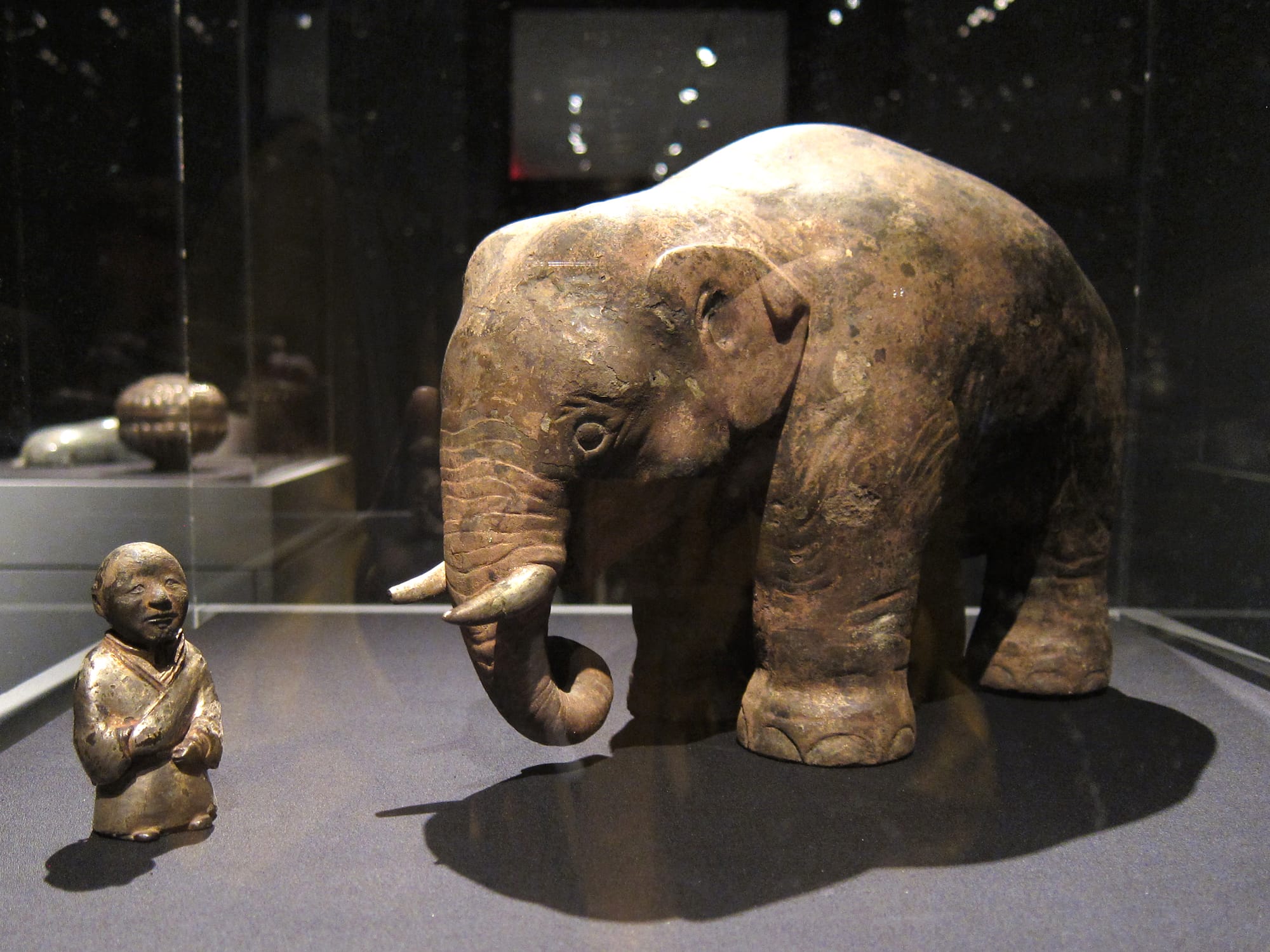 Mausoleums were built as extensive replicas of real-world residences, so most of the objects in Age of Empires are more quotidian in nature. Their occupants spared no expense, however, ordering artisans to create lacquered tableware, skillfully woven silk textiles, furnishings that boast intricate metalwork. Smaller versions of buildings stood in funerary complexes, too, as models of grand homes that conveyed an owner’s status and power. One luxury, multistory structure is so realistic, it even has a tiny guard dog sitting by its entrance. Animals themselves were popular subjects for standalone works. Some species were considered auspicious symbols, while others represent the exotic creatures that populated imperial zoos. An entire gallery at the Met is filled with animals, from elephants to cows, sculpted in a variety of materials.