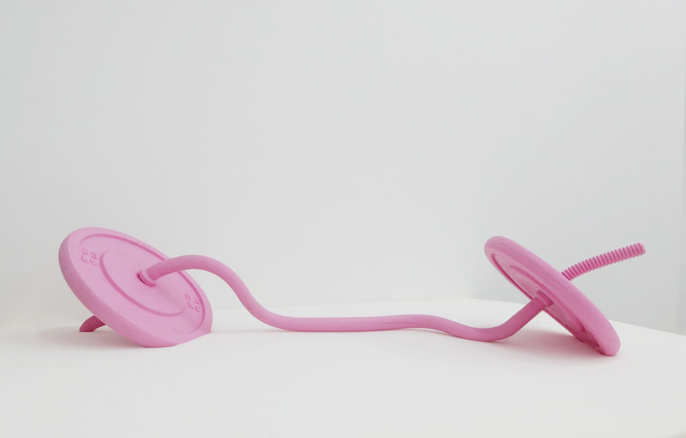 Fan’s paradoxical artworks also subvert the rationality of oppressive social structures. Objects rendered dysfunctional become a reflection of their service to a patriarchal system. In “Stranded between one act and another” (2016), two hairbrushes entangle with one another, with synthetic hair replacing bristles, capturing the incessant ritual of brushing long, “feminine” hair. In another, “T4T” (2016), a pink silicon dumbbell lies limply, defying the “masculine” rigidity and strength that typifies weightlifting. Fan thus calls for a softening of masculine values at a time when feminist movements are largely concentrated on female empowerment. Exercise and gyms incubate vanity as much as they promote health, so a floppy hand-weight inquires as to what society would look like if it were reoriented to value softness and tenderness over brute strength. In this new landscape, would vain objects hold the same social value, or would they become as useless as Fan portrays them?