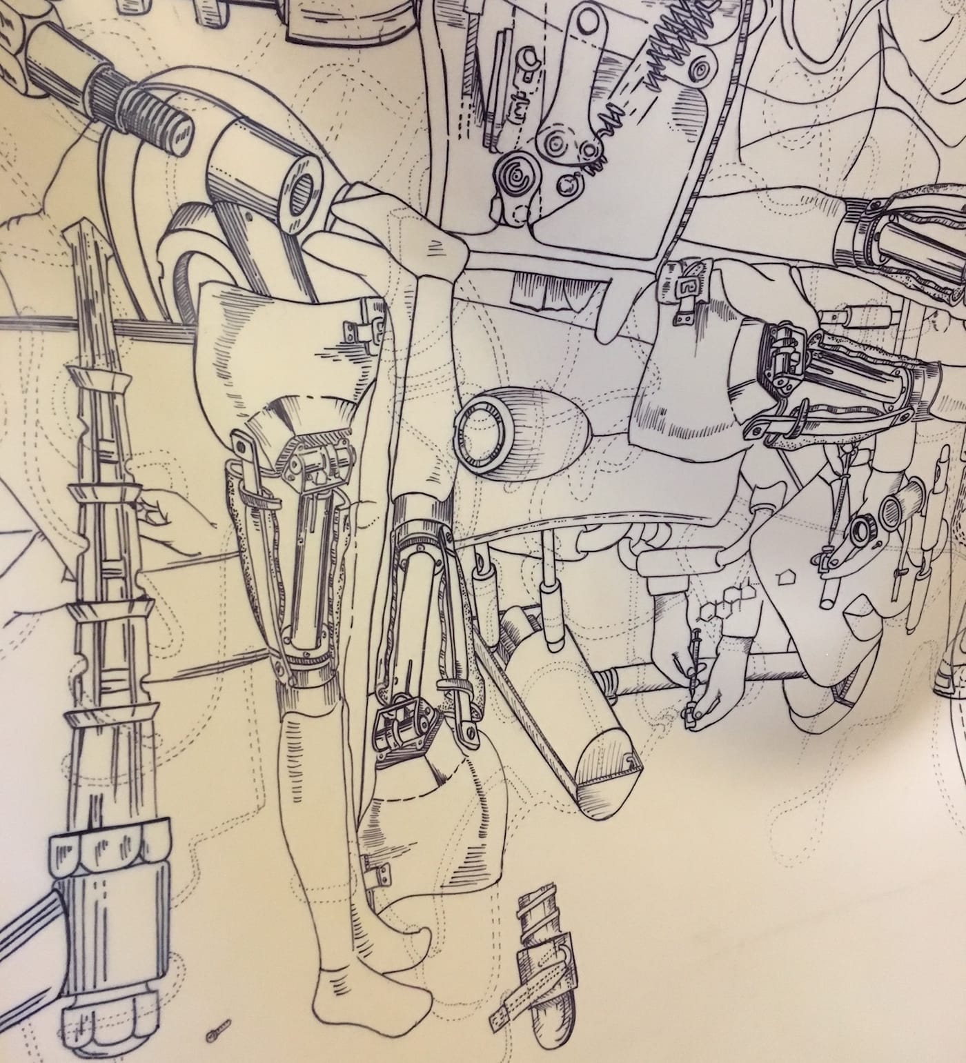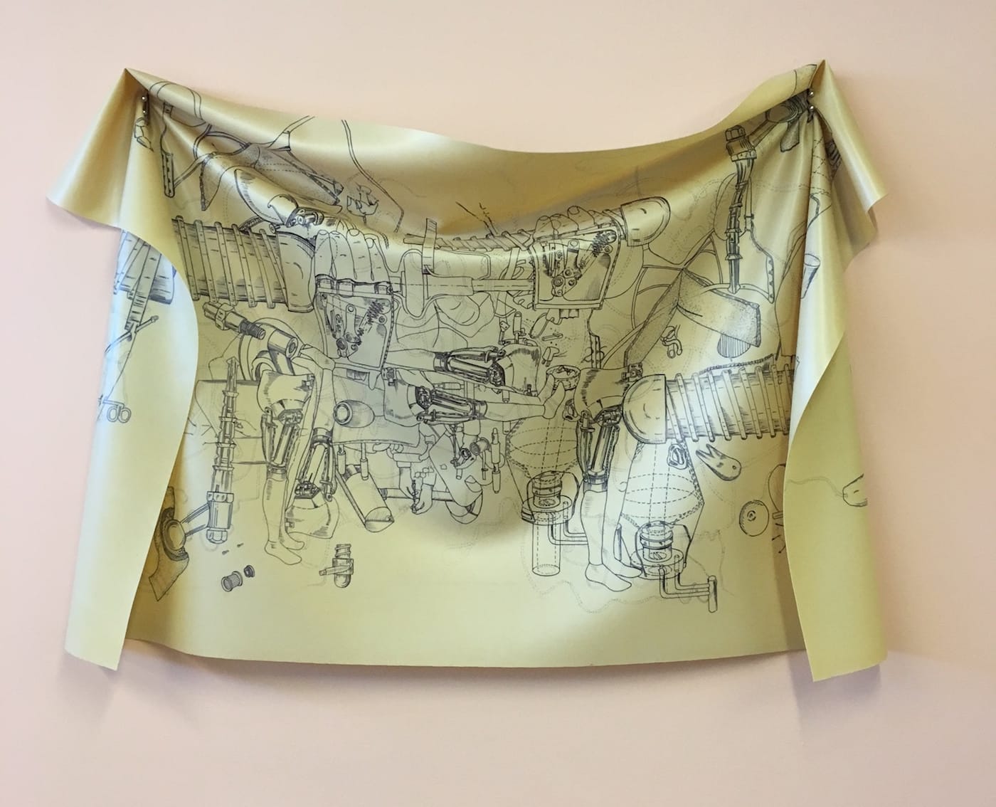Fan’s “To Hide” series (2017) further illustrates the ways patriarchal society infiltrates our insides. Tan-colored rubber sheets feature technical illustrations that were informed by patent drawings for medical procedures such as hysterectomies and breast implants. All of these procedures were invented by white cisgender men, which points to the way our societal acceptance of body modifications relies upon the white cis man as the ultimate authority. The drawings also feature disembodied limbs floating among a galaxy of ambiguous machine parts, giving the impression of a body being either deconstructed or assembled, while asking by and for whom.