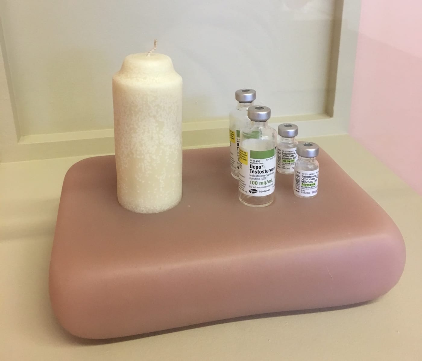 The exhibition stems from Fan’s experiences transitioning between genders and also between continents. As Fan explained to me before the opening, “I started thinking, how pervasive is the patriarchy in organizing power structures, and even bio-politically? Birth control pills are a cocktail of progestogens and estrogen. What are the feminizing effect on bodies who take birth control pills? Why are the bodies of uterus-owners policed more rigorously than others?” Fan’s work falls in line with much of the current discourse about the ways that drug use and administration are influenced by cultural, racial, and gender biases. Decisions about who has access to drugs and how they are packaged remains in the hands of a white capitalist patriarchy, and many marginalized people are forced to find ways to navigate these exclusionary policies. Fan’s piece “Testo-candle” (2016), a candle made from testosterone and beeswax, is of a much more welcoming shape than the sterile medical bottles placed nearby. Transforming sex hormones into familiar forms like soap and candles helps sheds the stigma associated with their usage, offering a more humanized view of hormone therapy and the trans experiences. Similar to the way Simone Leigh’s recent exhibition The Waiting Room interrogated conditions of institutionalized control and the willful ignorance that caused marginalized black communities to seek alternative forms of self-care, Fan envisions ways to circumvent the failures of the healthcare system and recognize the inherently political significance of caring for the gender-nonconforming body.