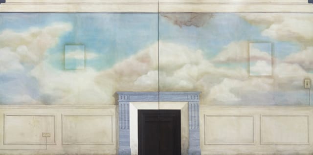 But the turn is not yet complete: the viewer must enter the next room devoted to Edward Krasiniski, who taped a blue line at a fixed height to the walls of his studio and home to connect his paintings into the spaces they inhabit. Here, aside from the taped line, rows of small, portrait-sized mirrors hang from the ceiling, transforming the space into a three-dimensional canvas with the line becoming the point of perspective; a horizon of sorts. Gazing into the mirrors, self-portraits captured by the mirrors’ reflection, viewers are caught within a live, representational space as both subject and object; activated and implicated in the performance of representation entirely. Total Politic.
