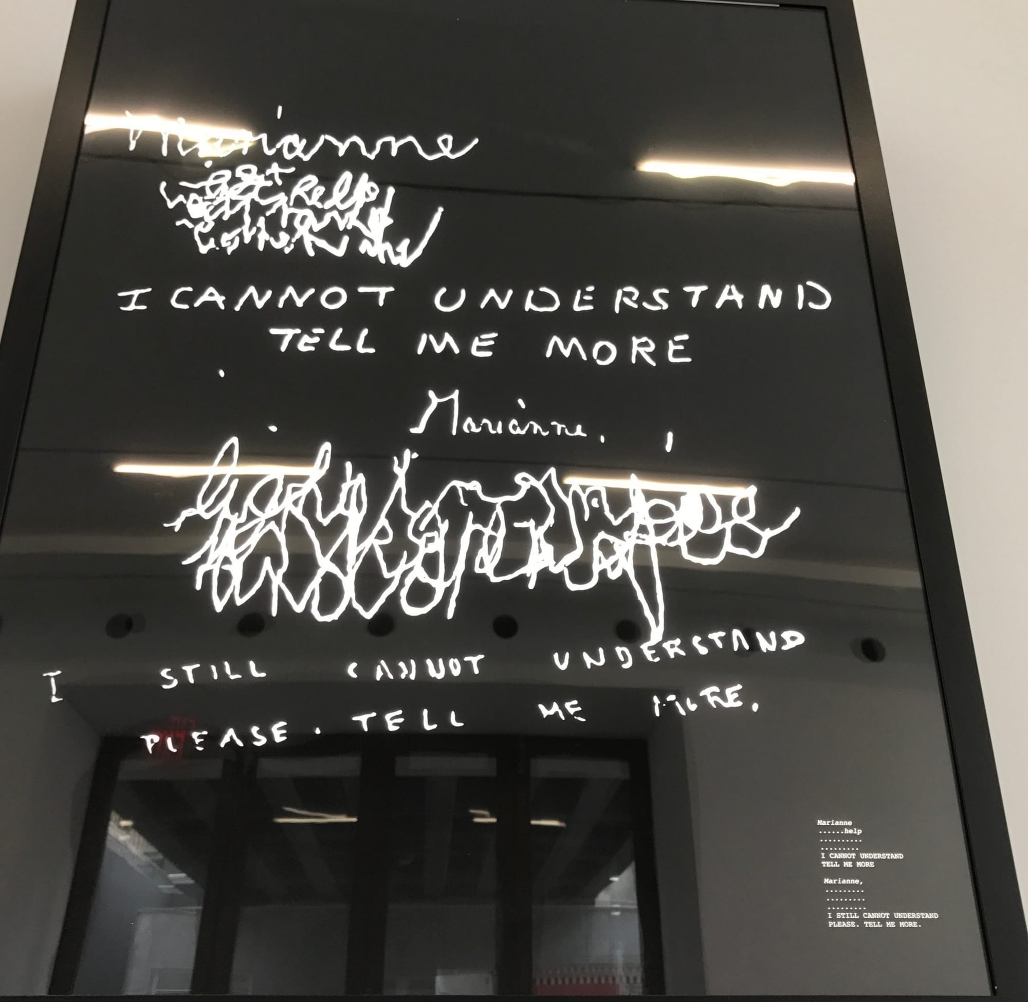 Typed translations are provided for all the auto-writing pieces (especially helpful for the lightbox that features a text written in the “language of light,” but not so much for the unknown “moon language”). But these notes will likely stir more uncertainty. One image from “From India to Planet Mars” provoked a question in me: Is unrestrained communication actually possible?