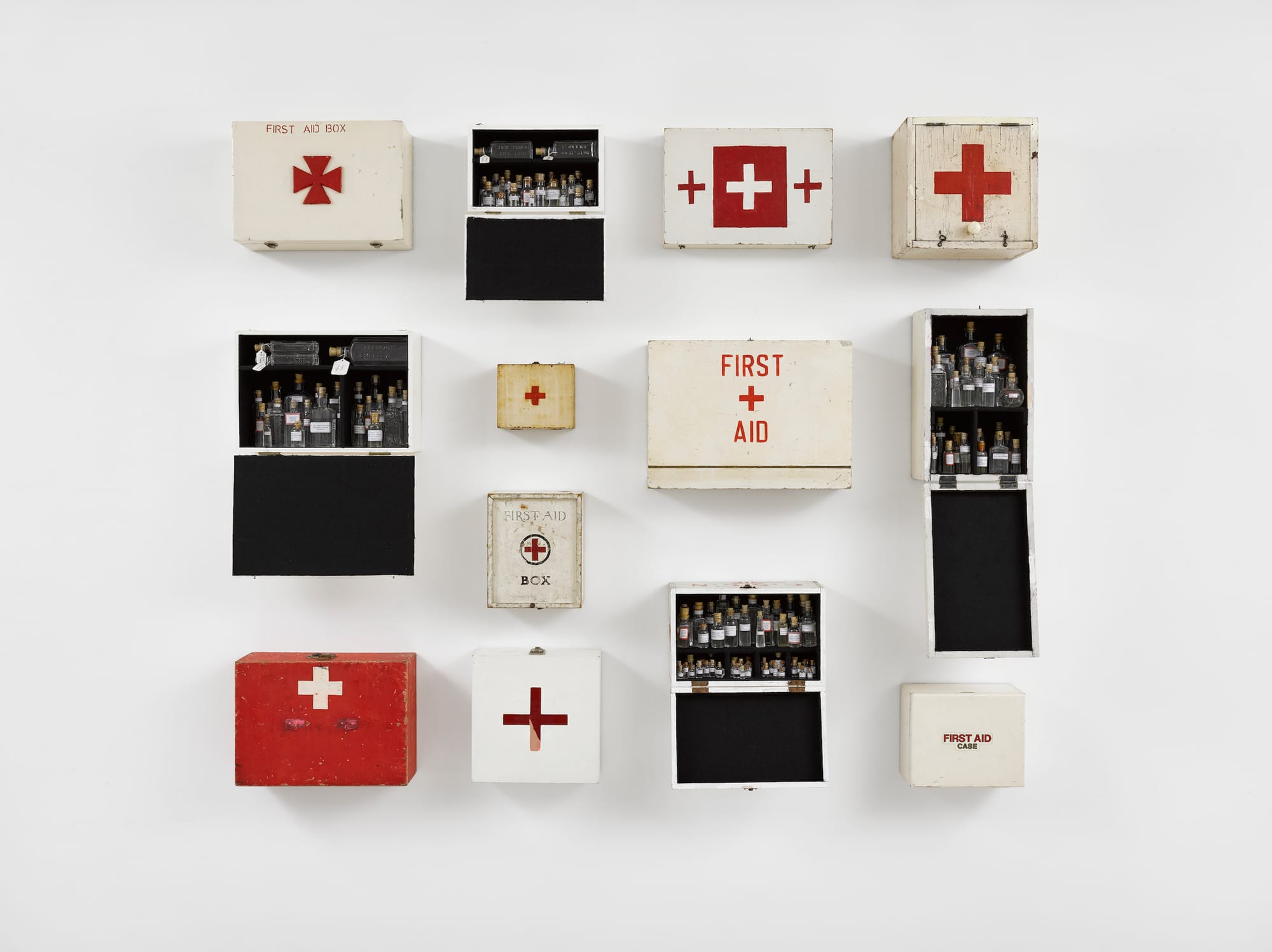 Inspired by a painting by Duchamp, this series makes use of a vivid collection of aura photos the artist sourced from the internet. Alleging to show one’s spirit, these photos radiate with voluptuous reds and blues, saturated purples and greens, the aura a cotton-candy wig, a technicolor haze, outside our brains. In some, the sitter’s face is obliterated by color — the spirit overtaking the body, if you will. Grouped in a grid of 50 pictures, After Duchamp shifts the way these fringe-y photos are viewed. In such an arrangement, they’re not isolated activities but seemingly more of a commonplace endeavor to locate the true self, endearing it with the selfies of today. In a similar way, “First Aid: Homage to Joseph Beuys” (1969–2017) turns the tables on art and alchemy. Mounted on the wall are a set of wooden first-aid kits that Hiller has stocked full of holy water she collected from sites around the water — e.g., Lourdes and “Sacred Spring Chimayo” at El Santuario de Chimayo, New Mexico. The piece is an edged tribute to Beuys’s status as an artist-shaman, someone famed for transforming the mundane into treasure objects. But with so many bottles of water from so many difference places, a question seems to be whether Beuys is alone in this alchemical ability.