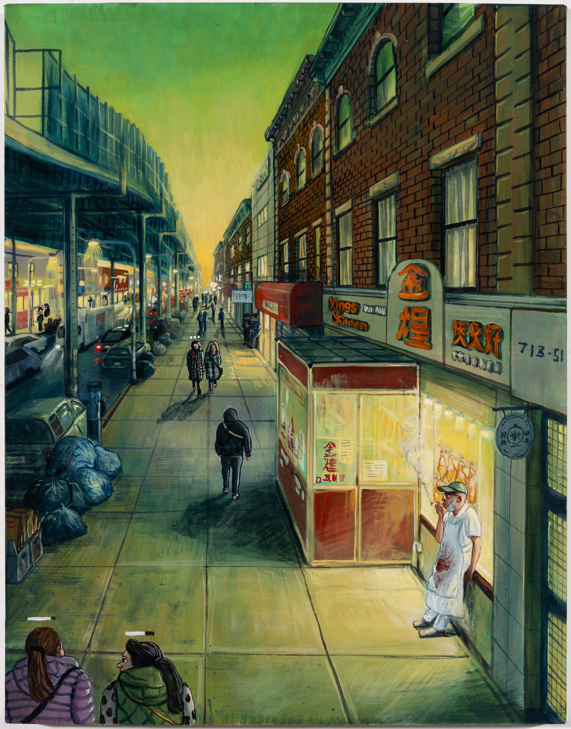 The result is a series of ubiquitous New York imagery: chicken hanging in a steamy restaurant window, delivery drivers waiting in the cold, and the unabashed stare of a bodega cat. Sometimes Tadić sketched what he saw and other times he snapped photographs, bringing both back to his studio to paint them in his characteristic cartoonish style.