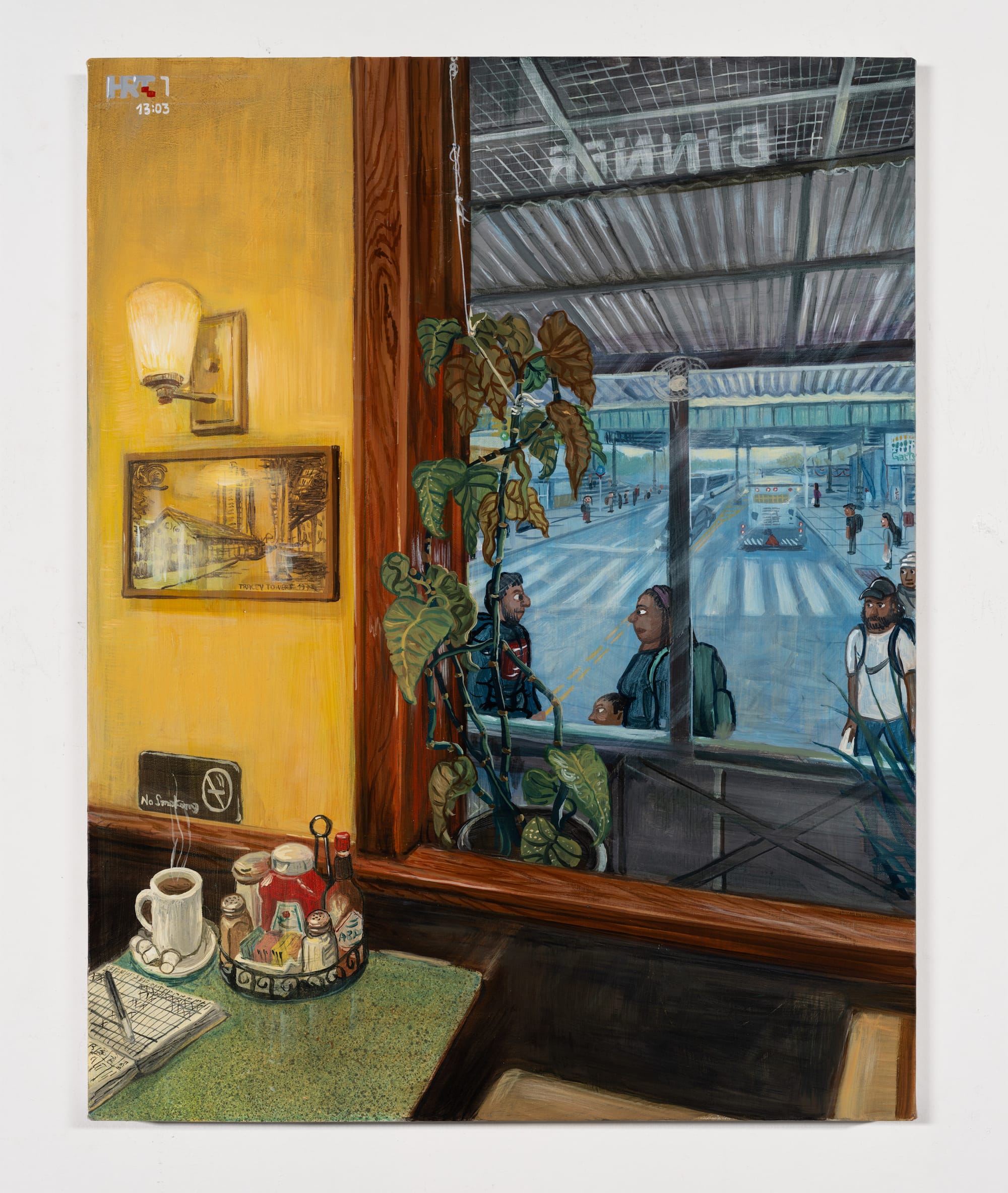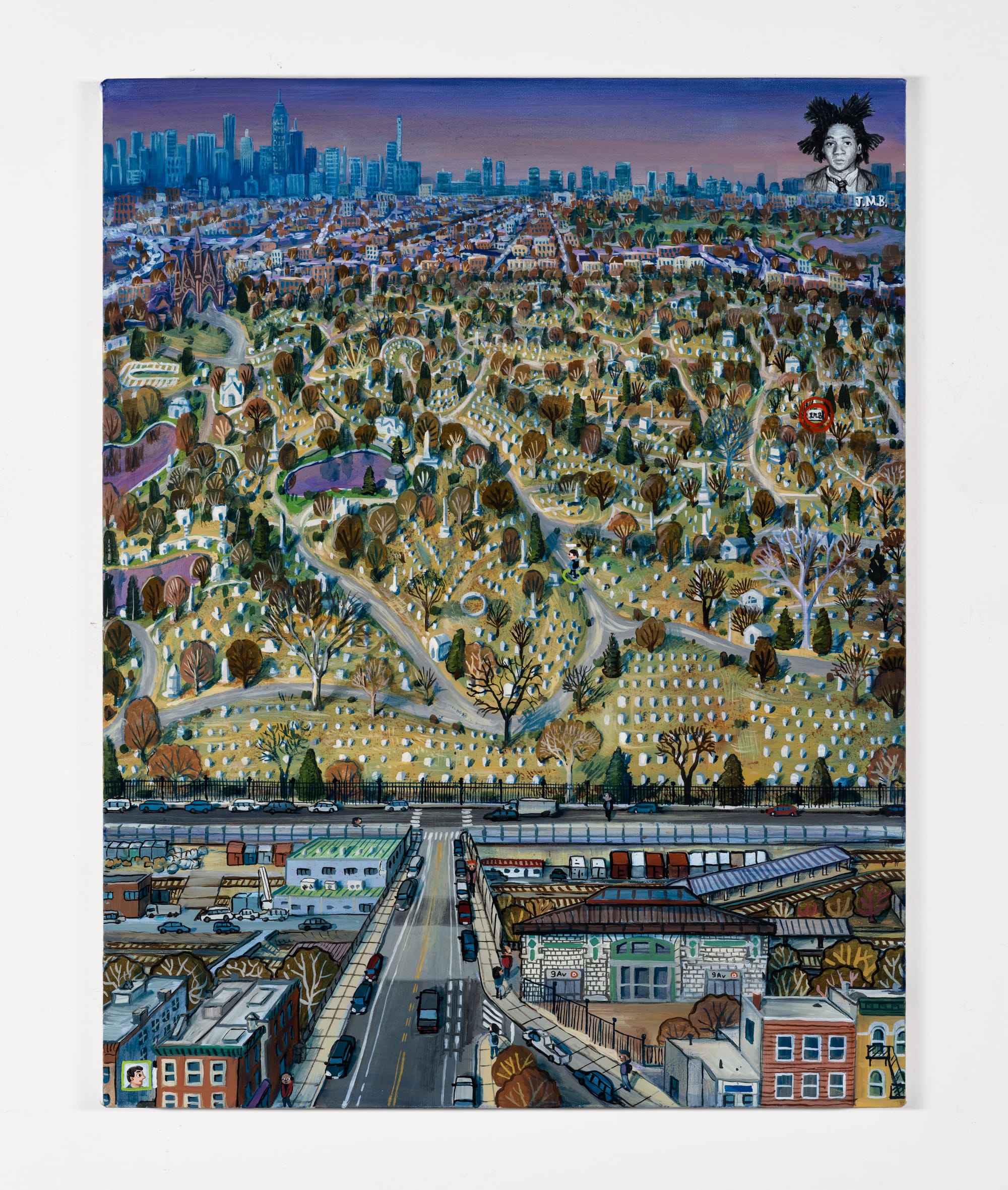 Other works venture beyond obsessive documentation. Tadić infuses his paintings with historical references and contextual information, often compulsively spilling his internal commentary onto the canvas, however lost it may be on the viewer. In his painting "Bedford Cafe - Bedford Park," a photograph tacked on the wall above the diner table depicts a train yard — the artist knew one was nearby and wanted to make sure this small fact made it into the piece. Other details are much more recognizable, even iconic: A headshot of Jean-Michel Basquiat appears above an overhead view of Greenwood Cemetery, where Basquiat is buried.