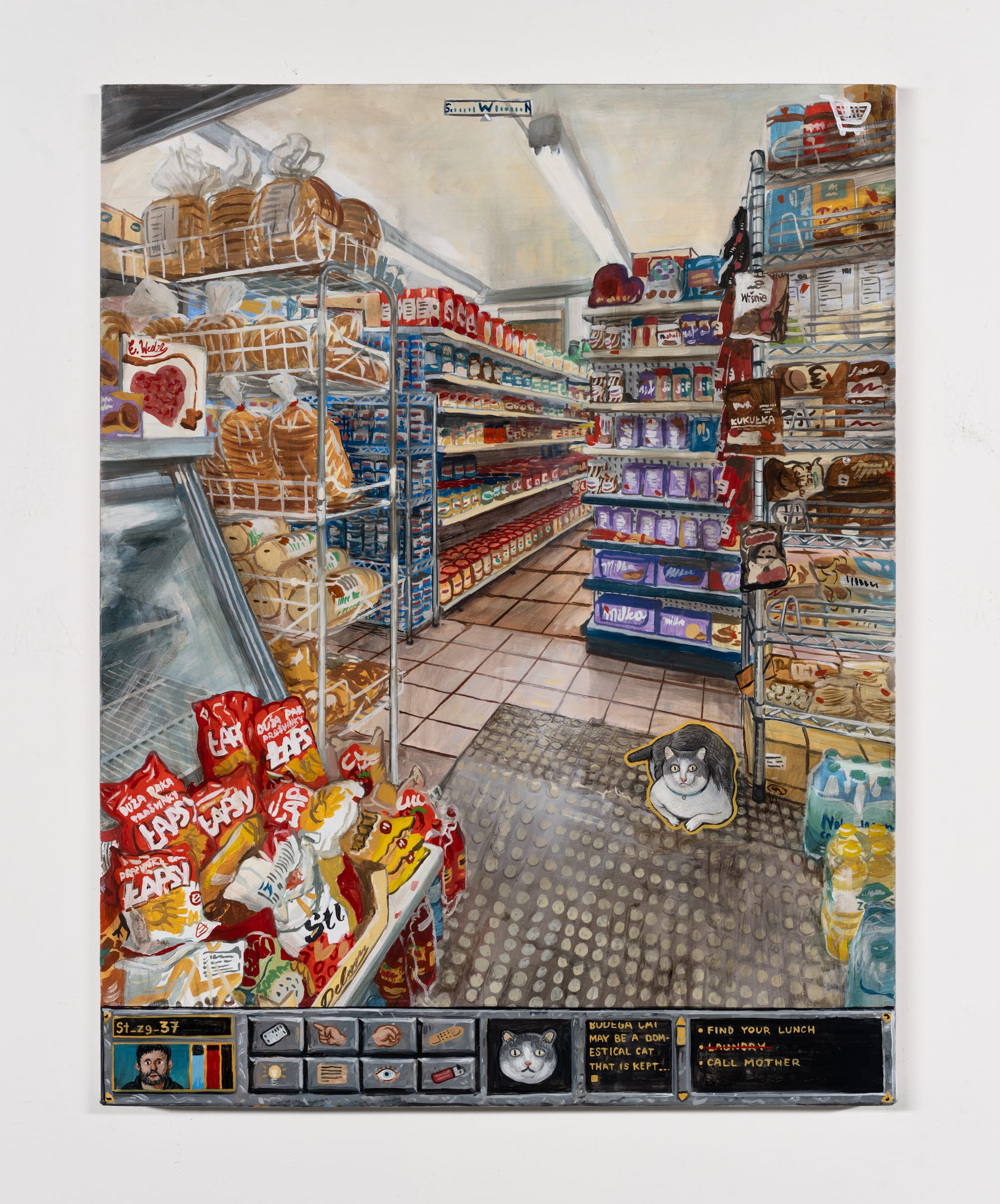 The rest of the work is painted from life. A steaming cup of diner coffee and a familiar set of condiments help set a cozy diner scene, one of the warmest and most familiar locations in the series. Many of the paintings include videogame references, such as imagery from a 1990s game called Elders Scroll in "Bodega Cat - 50th Street." Here, a relaxed central figure lies surrounded by shiny packaged junk foods, gazing at the viewer from his resting place on a rubber non-slip mat, sporting a slight look of fear but an even more convincing expression of not wanting to get up.