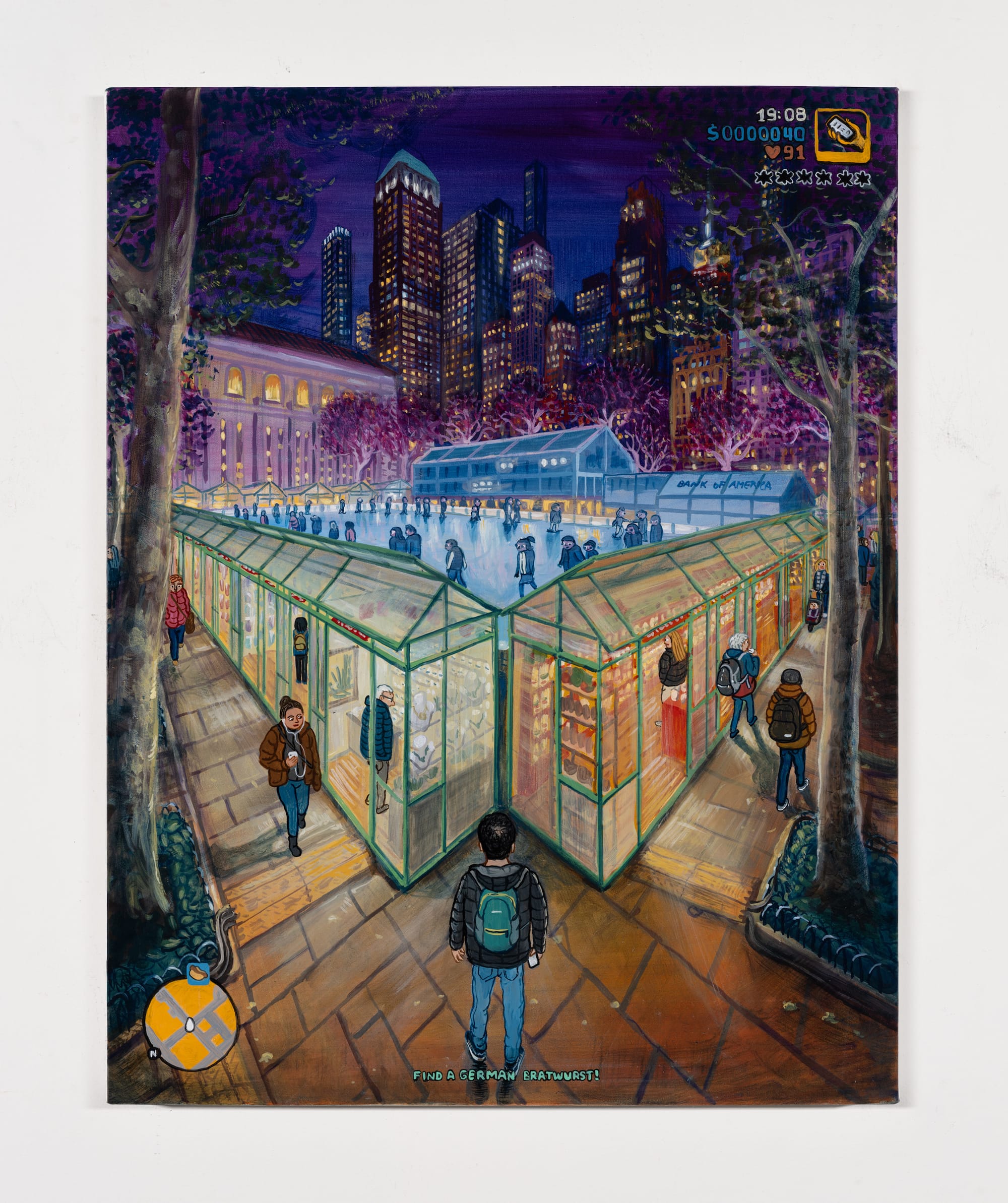 "Smoker - 20th Street" depicts two subjects standing below horizontal bars that appear when a file downloads, and another walking beneath the three dots that emerge when a person types on an iPhone. A warm-hued painting of the Bryant Park Christmas fair shows a navigator and a young man with an imaginary mission scrawled below: "Find a German bratwurst." It's a lighthearted response to what could be a very grim observation: That living in a place as dense and overwhelming can strip someone of empathy and make them reduce other people to side characters in their own life.