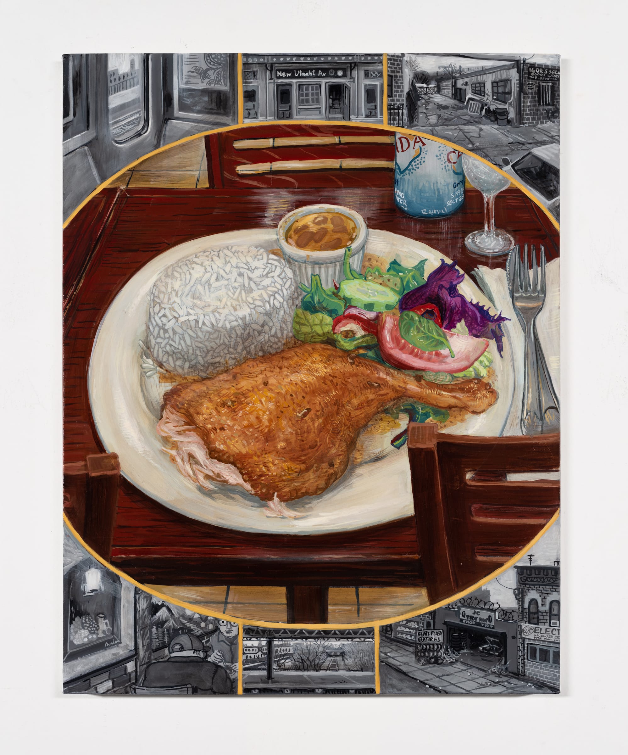 Tadić didn't romanticize what he saw on his subway journeys or alter the passengers' clothing or accessories. "I wanted the work to be in the now," he said. The artist's works are rife with timestamps: A man in a painting near the Fordham Theatre in the Bronx wears a mask and the Tommy Hilfiger tricolor coat that was everywhere last winter. In "Ecuadorian Restaurant - 62nd Street," Tadić paints his chicken dinner in vibrant colors and his surroundings in black and white, rendering a pair of diners, the subway entrance, and the brick buildings outside as washed-out sketches in comparison to the meal in front of him. A snapshot of a winter morning outside of the Barclays Center on Atlantic Avenue shows delivery app drivers, bundled up and chatting with their scooters parked waiting for the first pickups of the day.
