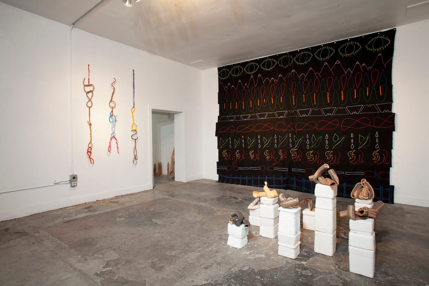 A trio of looped and knotted clay extrusions suspends from another wall. Titled “surgeon’s knot,” “acrobat hitch,” and “icicle hitch,” the three pieces hang tenuously, continuing the uncomfortable dialogue with gravity initiated in “Repose.” Their blues, reds, yellows, and ochres come from watercolor Marchand has painted onto the clay, and from the colorful paracord she has included in these works. Paracord is popular with both the military and survivalists, and its inclusion in these works suggests the same apocalyptic future signaled by the disintegrating salt blocks.