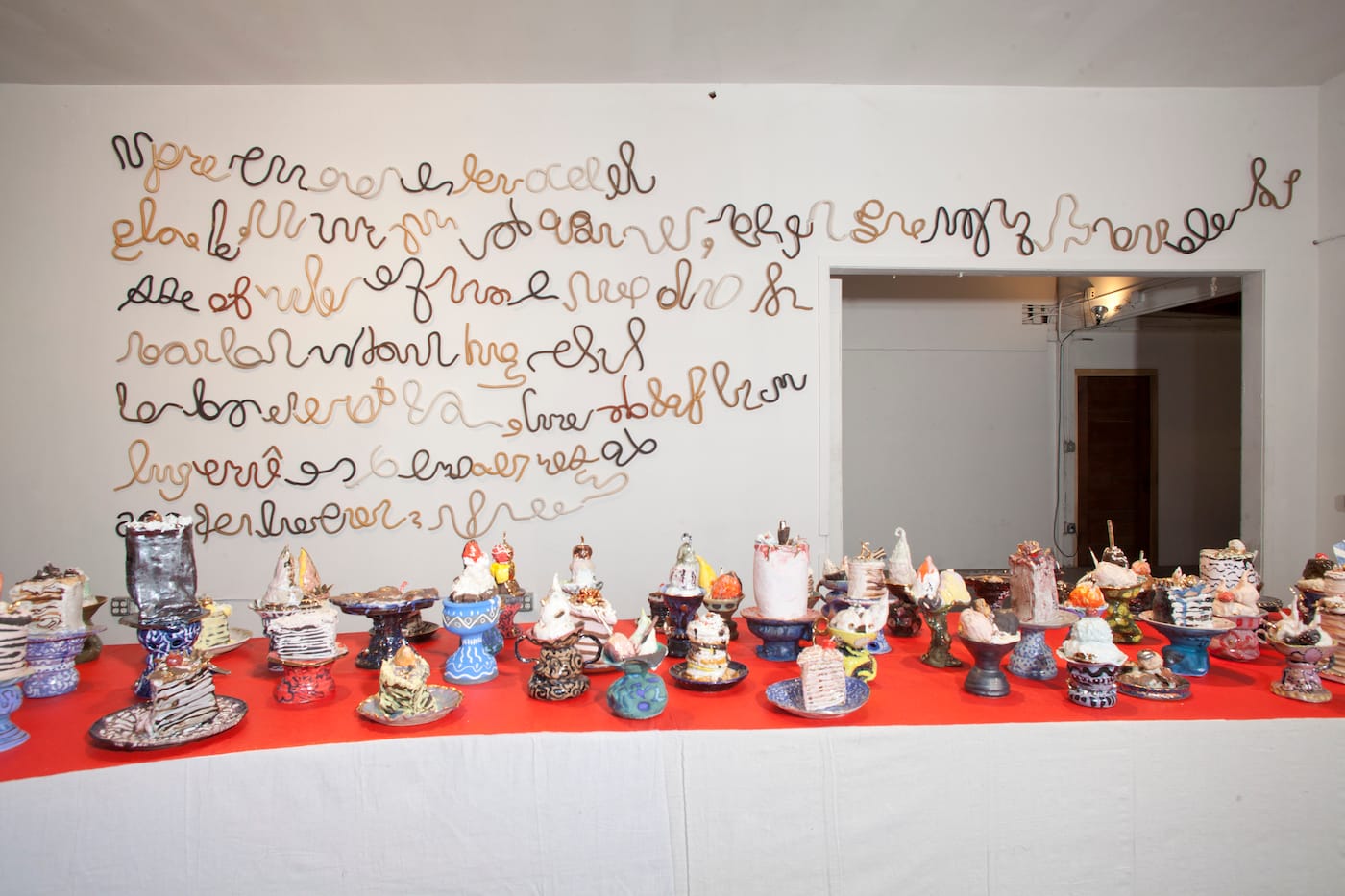 Mounted on the wall alongside Wolek’s confections is Marchand’s “international treaty,” where lines of cursive ceramic writing extrude, bend, and loop to resemble words but are actually only inscrutable glyphs, as fittingly elusive as any meaningful treaty these days. Marchand’s take on global accord reminds me of Ernest Hemingway’s phrasing in The Sun Also Rises: “Isn’t it pretty to think so?”