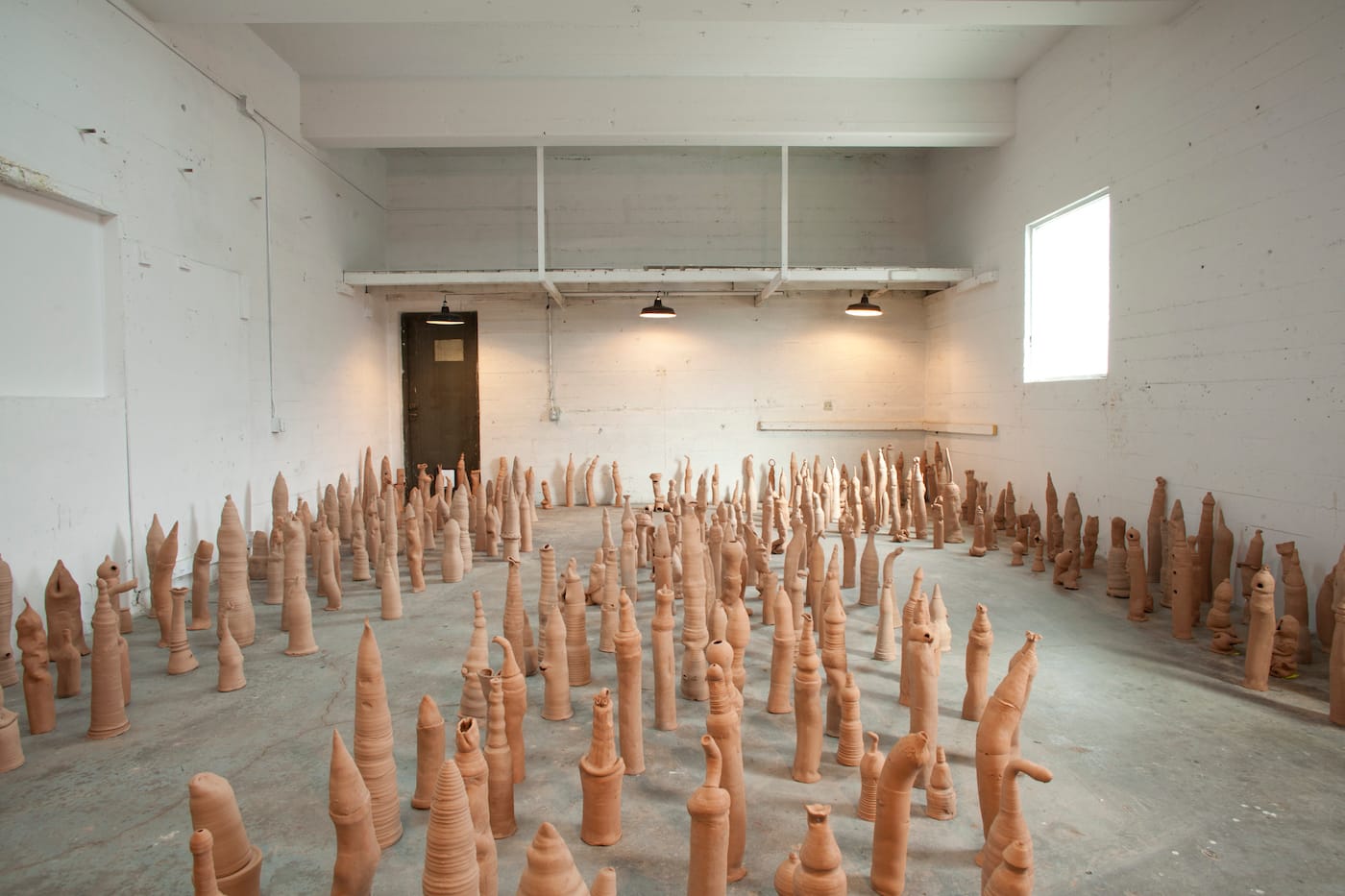 NowSpace has an additional room in the back where munitions were manufactured during World War II. Wolek and Marchand were in residency on-site for a month prior to the show, and they used this room as a site for collaboration. The result was their installation “soft ammunition,” hundreds of unfired clay missiles standing in clusters on the floor before their leader, who wears a military style cap and faces the assembly. Each bullet is jointly made, the bottom by Marchand and the upper portion by Wolek. The abject, crumpling shapes suggest flaccid penises, while their terra-cotta color and arrangement recalls the ceramic army buried with Qin Shi Huang, China’s first emperor. The installation echoes Nicole Eisenman’s “The Lesbian Museum, 10,000 Years of Penis Envy” (1992), in which the artist filled the Franklin Furnace with a stupendous array of dildos and other sex toys. “Soft ammunition” resonates with the current tsunami of male sexual assault revelations and the threat of military conflict with North Korea. The fact that this work reverberates back a quarter century and all the way to 210 BCE indicates just how intractable are our problems.
