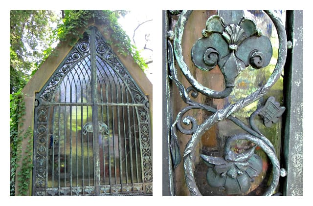Woodlawn is also unique as a place to see a concentration of work by late 19th century and early 20th century, as well as many contemporary, women artists, including sculpture by Janet Scudder, Sally James Farnham and Anna Hyatt Huntington. Sculpture was often an “acceptable” profession for women of the Victorian era, and by placing work in cemeteries they were able to exhibit among and compete with the most significant male sculptors of their time. An incredible glass-doored mausoleum by Marie Zimmermann has her elegant metalwork winding through over the gates opening to a narrow interior with a stately urn box positioned against a landscape in stained glass.