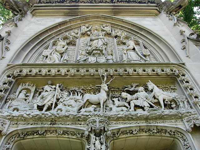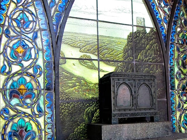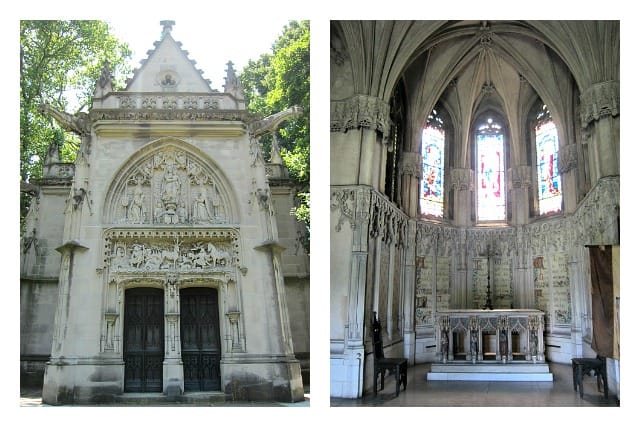 The Belmont Mausoleum was built in 1910, and contains the tombs of Oliver Hazard Perry Belmont and Alva Erskine Vanderbilt Belmont. The story of St. Hubert encountering a stag with a crucifix between its antlers while on a hunt is depicted in stunning detail above the mausoleum doors, with all of it having been carved on-site at Woodlawn. Gargoyles fly out from the sides of the Gothic Flamboyant structure and the interior is just as soaring, with Guastavino arches, a triptych of stained glass, a carved altar and religious murals. Alva Belmont had commissioned the tomb for her husband and it was completed in 1913, supervised by Richard H. Hunt.