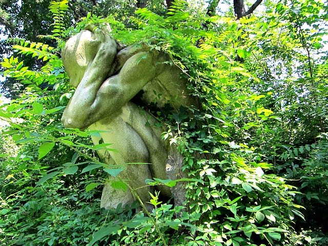 Treading through the grassy lawns or along the winding roads, there are striking monuments everywhere you look, and even some hidden in the greenery. Wrapped by a spring’s growth of vines is the “Outcast” by Bronx-based Italian sculptor Attilio Piccirilli of the Piccirilli Studio, who created the Maine Memorial in Central Park and sculptural details on the Frick Museum. His work always focused on the universal figure of the everyman and he has several pieces in Woodlawn, with this marking the grave of a nephew who perished in WWII. It is a copy of an original that was in the St. Mark’s in the Bowery churchyard, which has since been lost.