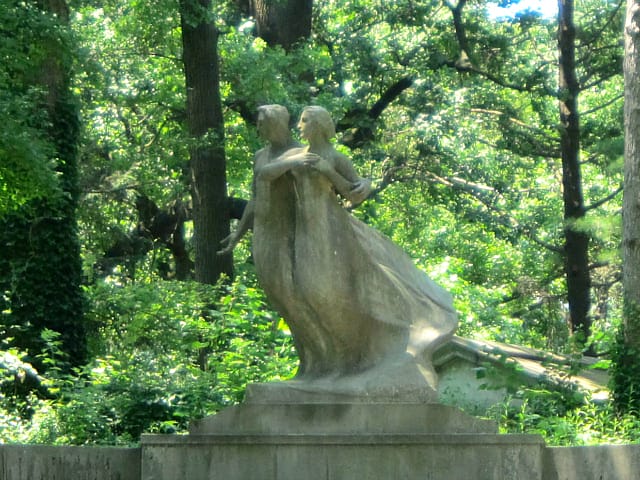 In June, I explored the rich art collection contained within Green-Wood Cemetery in Brooklyn, and this past Sunday I took the 4 train to the end of the line for a tour with Susan Olsen, the Director of Historical Services at Woodlawn Cemetery, to further discover the history of art in New York City’s cemeteries. I also met with Patricia Cronin, whose above “Memorial to a Marriage” I wrote about in October 2011 for Hyperallergic. The bronze sculpture depicts Cronin and her wife Deborah Kass asleep together, and it was created as both a monument to a marriage she thought they would never be able to have, and also as a future memorial for them in the cemetery. While unique sculptures like Cronin’s that act as personal monuments are not as popular as they were a hundred years ago, they continue to serve as a final and meaningful way of commemorating a life through art. Surrounding Cronin’s sculpture and throughout the cemetery are other beautiful examples of 19th, 20th and 21st century art, which were made or acquired for graves and tombs instead of the gallery.