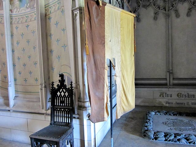 Alva Belmont was an influential figure in the women’s suffrage movement, and her Votes for Women banner is kept on display by her tomb in the mausoleum. Near the door is the chair that once was the Belmont’s gardener’s, who would come and open up the mausoleum so that the public could see inside.