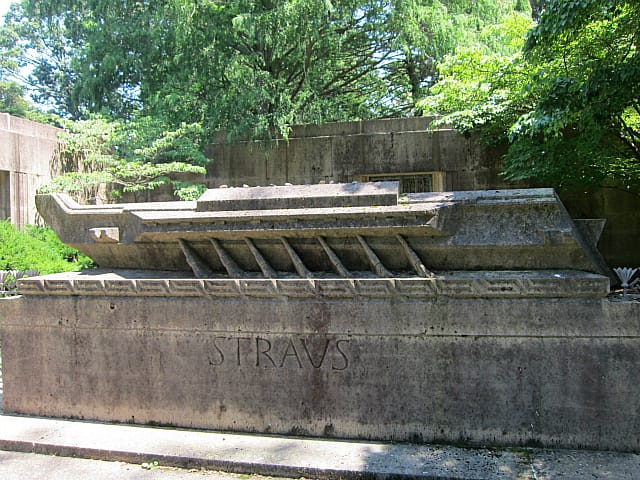 Across from the Bliss Memorial is that to Ida and Isador Straus who both perished on Titanic, and a funeral barge carved by Lee Lawrie rests solemnly above their name before a structure designed by James Gamble Rogers accessed by gates created by Samuel Yellin. Isador was an owner of Macy’s and also served as a US Congressman before he and his wife were lost to the ocean, with Ida’s body never having been recovered.