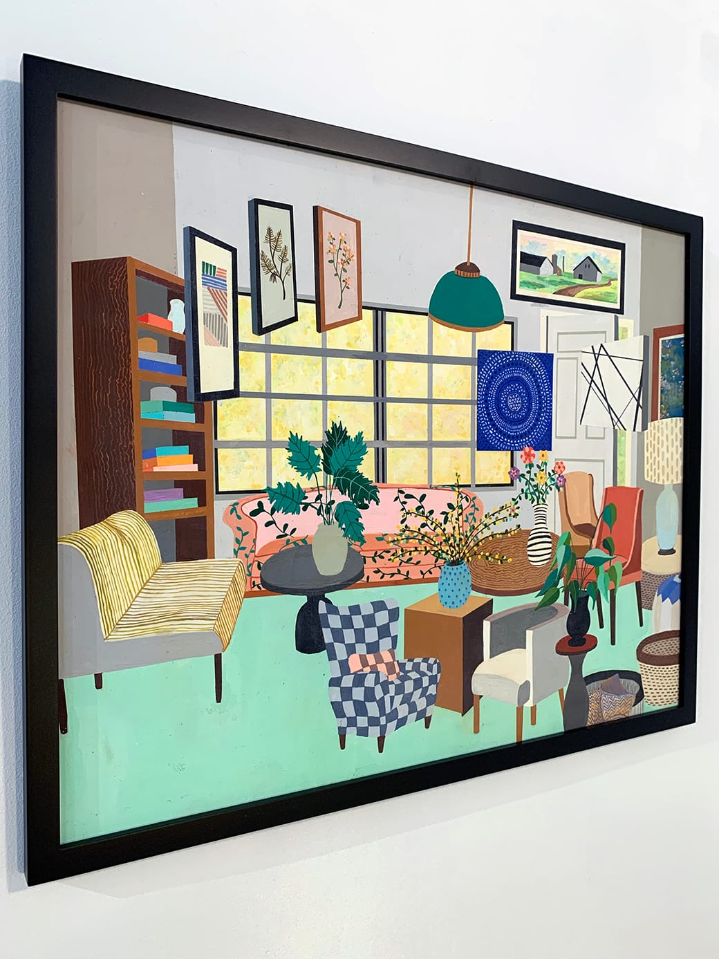 In a similar manner, the paintings and collages of Yayoi Asoma at Site: Brooklyn Gallery, subvert the trappings of traditional décor. In her collage works, furniture floats in space against a plain white background, cut and pasted like an AR app designed to visualize products in various rooms. In a series of colorful yet disorienting paintings, warped perspectives and oddly layered objects pile up in a mashup of commodities. Striped upholstery sits beside checks and florals, modernist furniture clashes with boho styles, and framed artwork floats nebulously throughout the room. Like trendy representations of a not so distant future, these paintings question the aesthetics of choice and the objects used to represent taste.