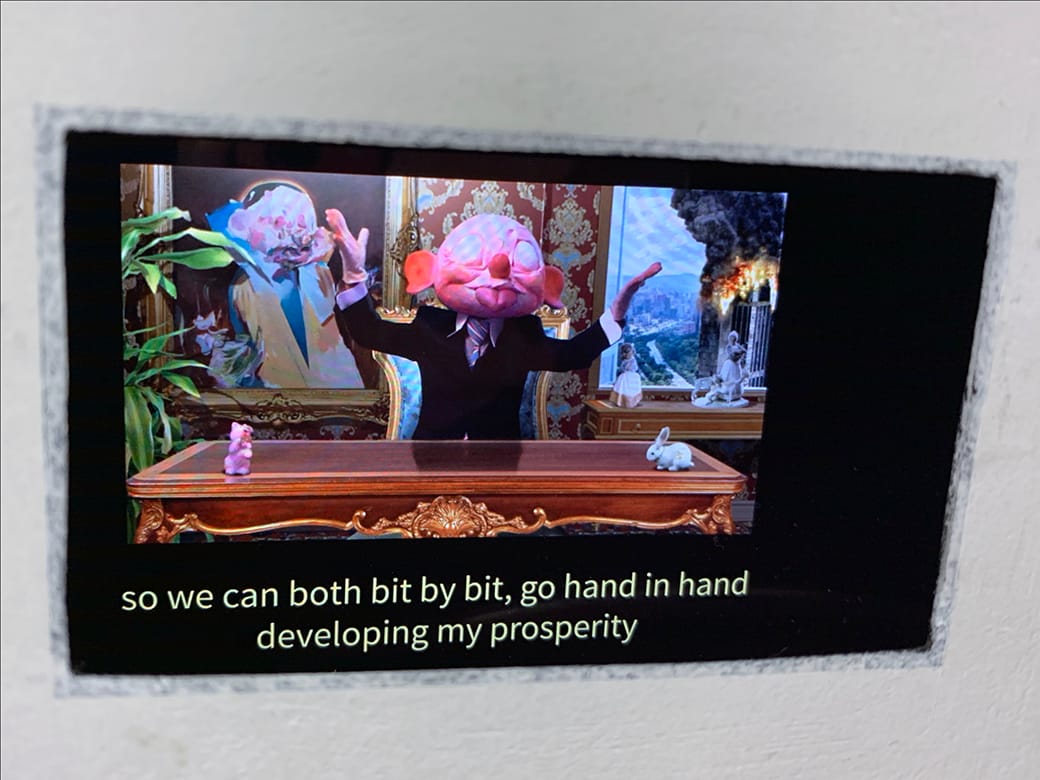 Confronting the fear and discord wrought by politicians with a sense of humor sums up the practice of Hermann Mejia, whose caricature paintings were inspired by the current happenings in his native Venezuela. His ambiguous characters, mimicking rabbit-like creatures, take on the humorous, selfish, and exaggerated personalities of many public figures. “I watched my friends change,” he explained, “once they began working in the government.” A small video displayed within a cramped box showed a suited man in a goofy mask pontificating, making grandiose statements like “So we can both, bit by bit, go hand in hand, developing my prosperity.” Rather than bluntly critique, Mejia’s works suggest how absurd and dismissible these figures are.