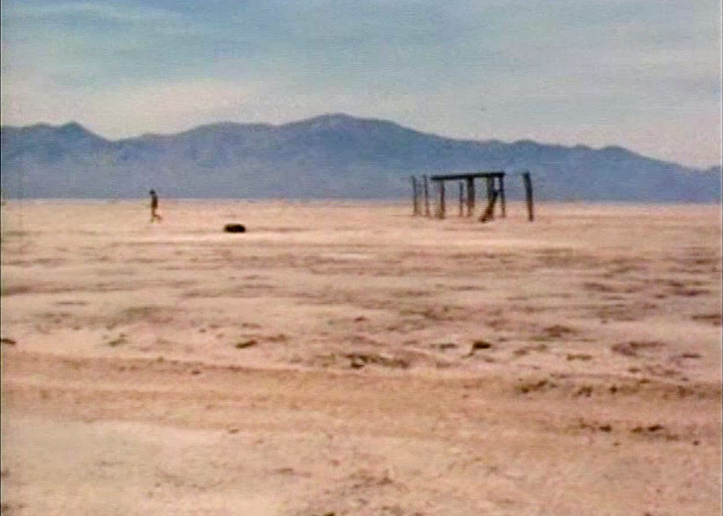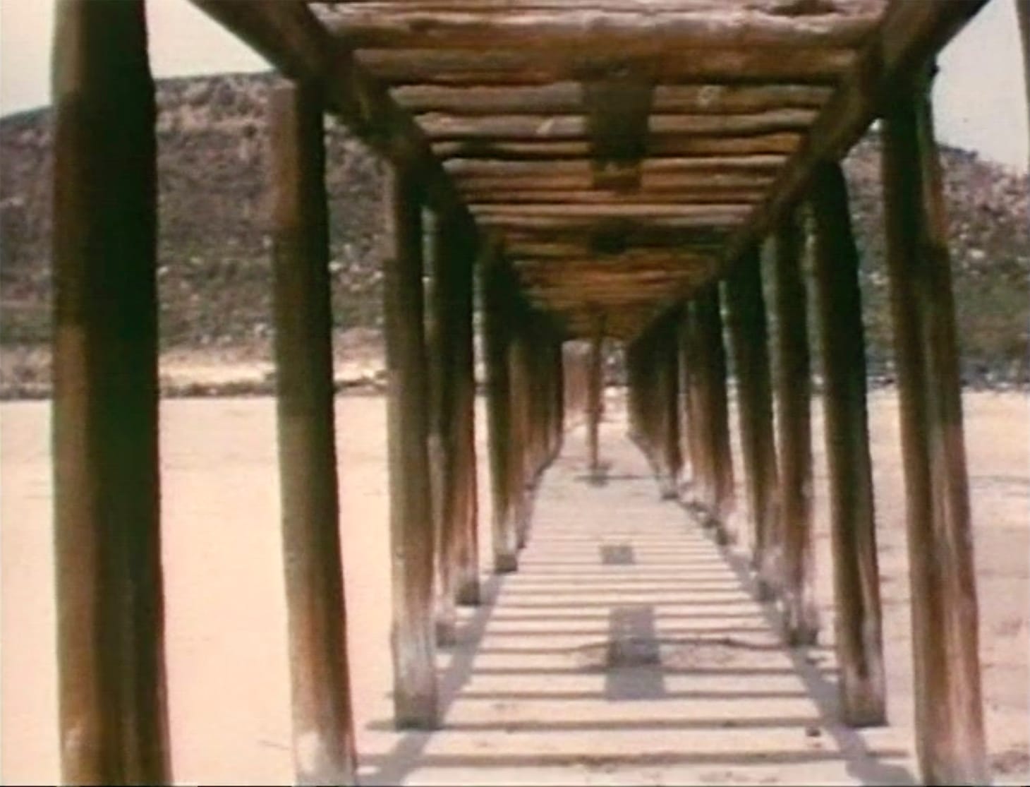 Single images and horizontal scans comprise the majority of the film until it is almost over. Holt follows Virginia Dwan — Smithson’s gallerist and the couple’s occasional travel companion — as the group proceeds through a narrow, open-air wooden structure. Utah Sequences concludes with a shot of the unencumbered sky, then the walkway’s beams are exposed in progression, rendering the structure as minimalist sculpture. Returning to the same horizontal view of the walk, Dwan is no longer in view. Holt continues alone until a central beam blocks her path, ending the film.