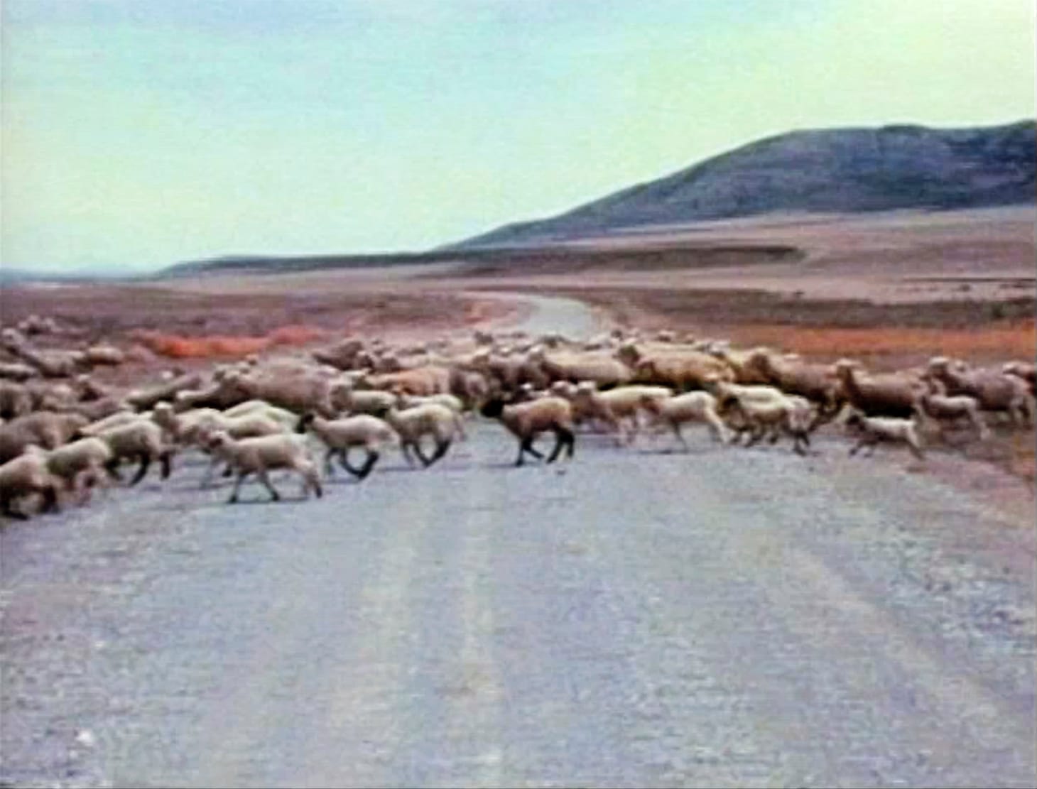 Holt’s practice consistently returns to translations of place, employing various optical devices. In this 10-minute silent montage, shot in 16mm color film, each segment trains on a minute aspect of Rozel Point. The focus on light as medium (which Holt returned to throughout her career) is immediately apparent. Objects glint and shine; the lake’s water undulates and glistens; salt sparkles on tumbleweed, rocks, and animal carcasses. All matter is treated equally on this lakebed known for its harsh conditions. Serene images give way to the frenzied progression of sheep. Cattle follow, vying for space among abandoned vehicles on the nearby road. Smithson and Gianfranco Gorgoni — hired to document Spiral Jetty during and after its completion — walk the narrow lane between the earthwork and nearby oil mining operations.