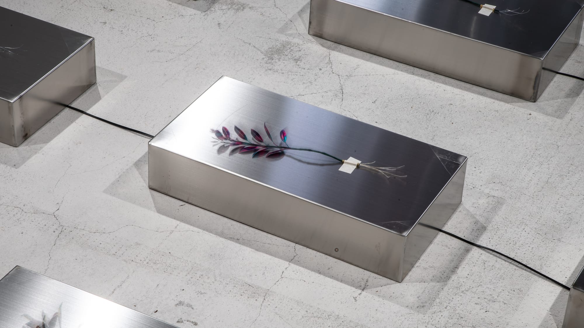 Taiwanese artist Chen Han-Sheng combines twined flowers (used in brides’ wedding headdresses in Taiwan) with a print of a plant in his 2020 work “When I Was a Child,” reflecting on a boy found dead in his school bathroom, who was known to be bullied for “feminine” behavior. His death led to the Gender Equality Education Act in Taiwan. Through an email, translated by Leung, Han-Sheng said the boy’s mother kept a plant, a Rohdea japonica, which was her son’s, like the one depicted in his work.